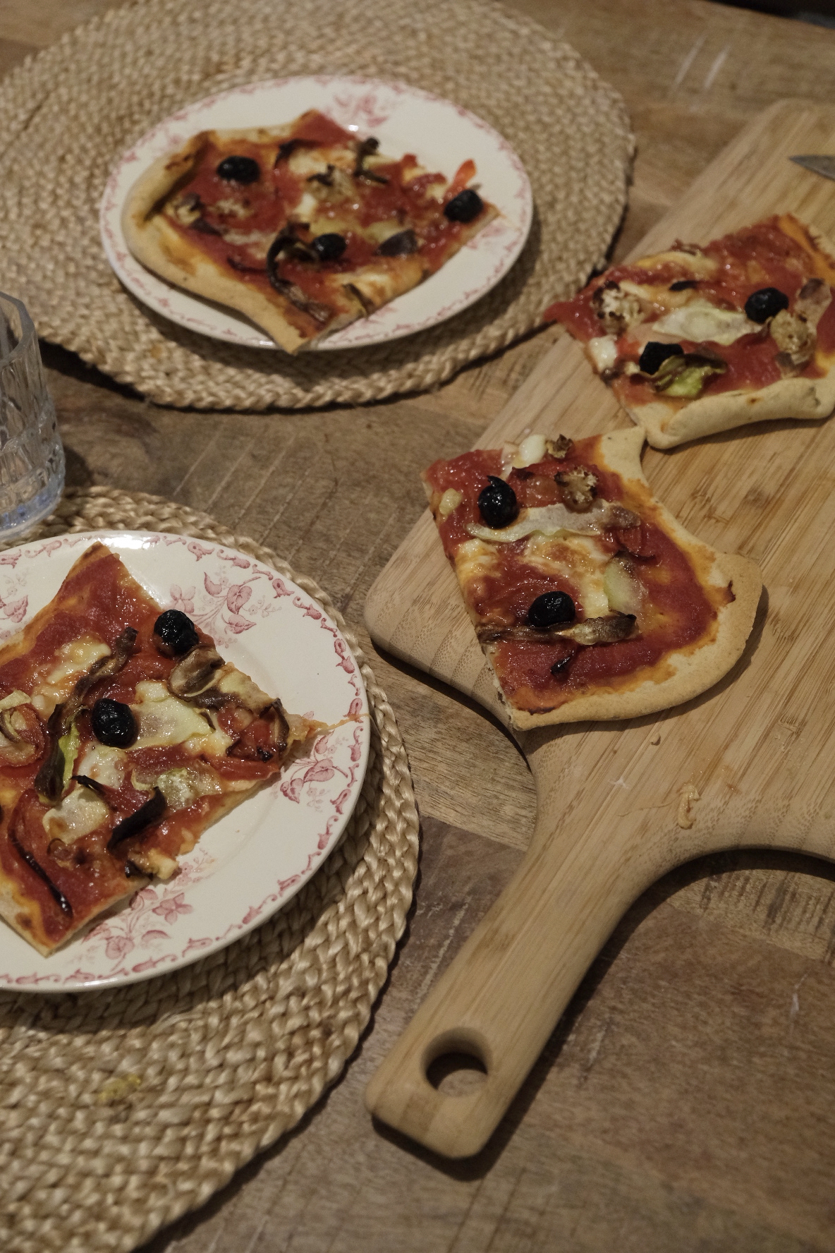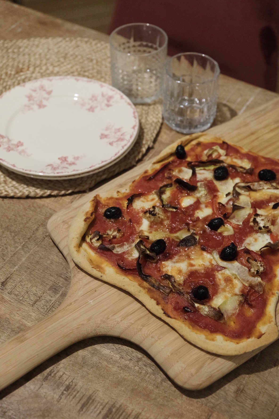Ici, pizza : sauce tomate sans sucre ajouté, champignons, courgette chou fleur grillés, olives noires, mozzarella