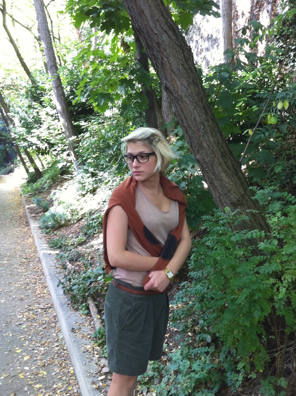 Une tenue avec de nouvelles pièces. Un pull couleur rouille, avec coudes renforcés daim, H&M.
