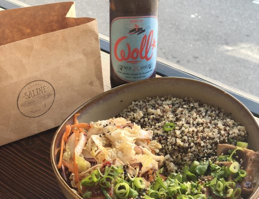 26 juillet 2019Décidément la rue Gambetta à Biarritz est remplie de pépites : CIBO, le CAB, La Crique, Caroe… et Saline ! Le lieu est lumineux, papier peint palmiers, meubles en bois, tables…