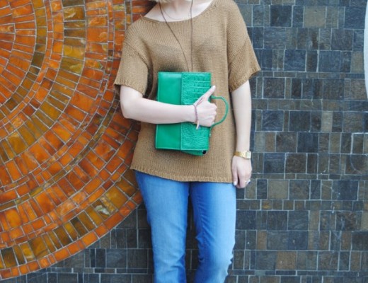 25 mai 2011Tout il est nouveau ! Pull camel en mailles de chez H&M. Pochette et pantalon chinés dans un vide grenier parisien. La pochette est en cuir vert et le pantalon est…
