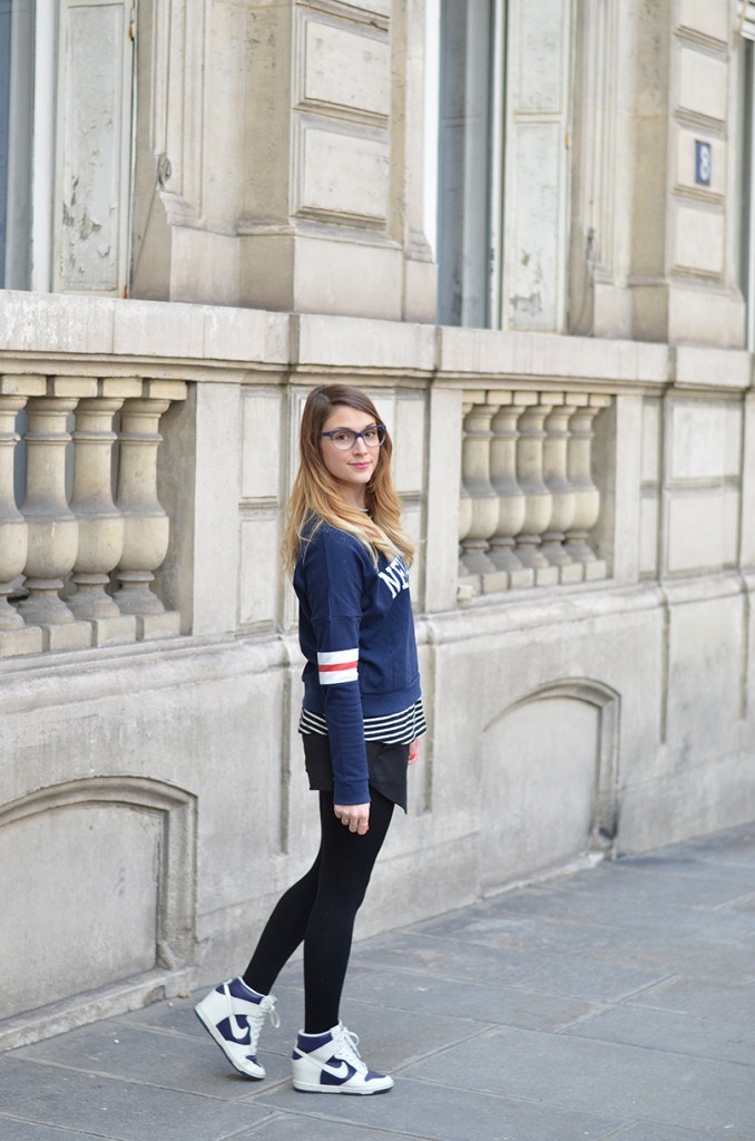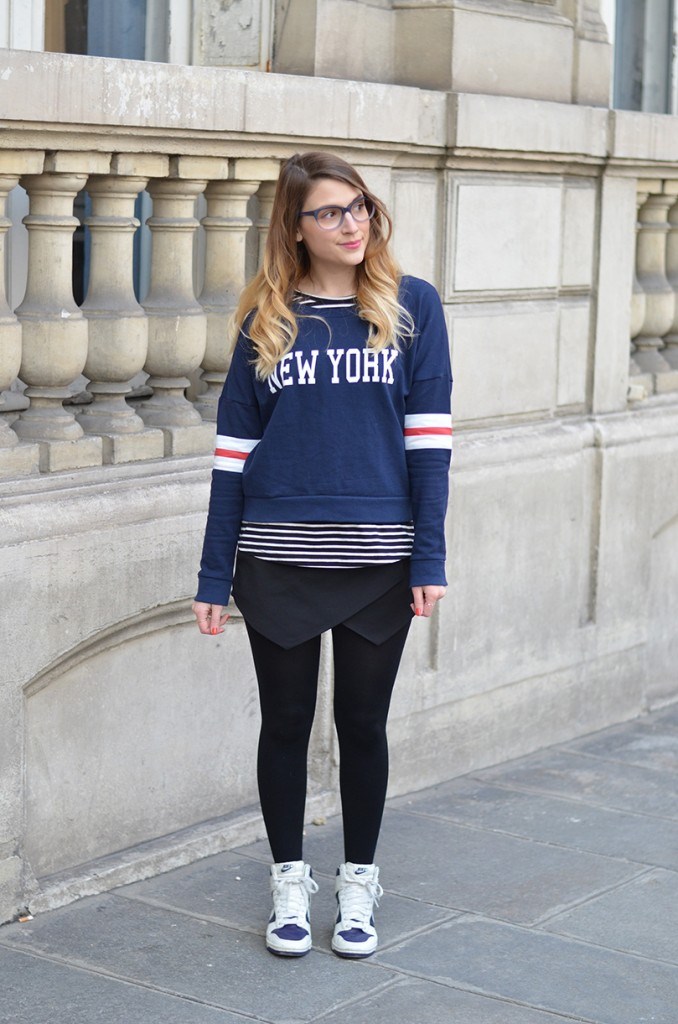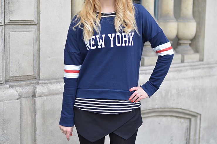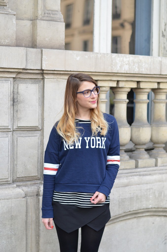 Dans ce look tout il est nouveau. Le sweat est une trouvaille Jennyfer. Je l’adore, il est un peu court avec des bandes sur les manches, très sport. New York ??? Aucun hasard, je prépare mon séjour à vrai dire…. C’est une grande (très grande) décision pour moi. Je ne prends pas l’avion mais je me soigne. J’ai un vol très court prévu très bientôt et un second un peu plus long dans deux semaines… Ces deux déplacements sont prétextes pour m’entrainer. Je fais des efforts.