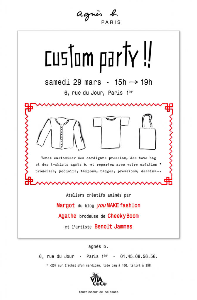 Article invitation ! agnès b. organise ce samedi 29 mars sa custom party dans sa boutique rue du jour à Paris de 15h à 19h.