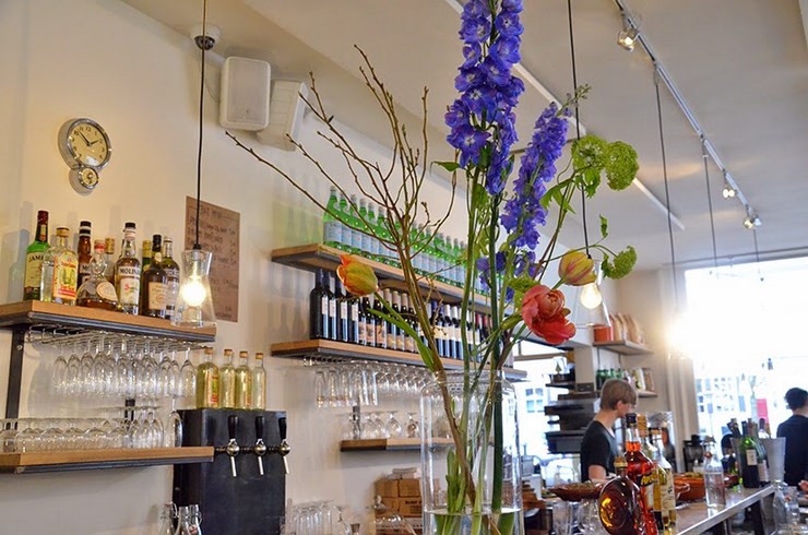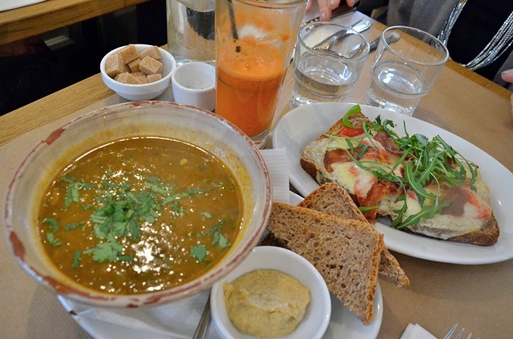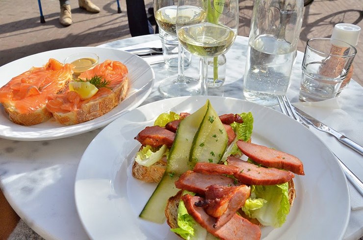 Une carte bio (voir ici) de sandwichs, soupes, tartes (sucrées et salées) et jus frais. La présentation est déjà un régale et la terrasse couverte au bord du canal est très agréable.