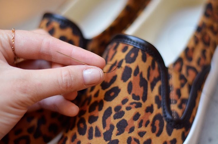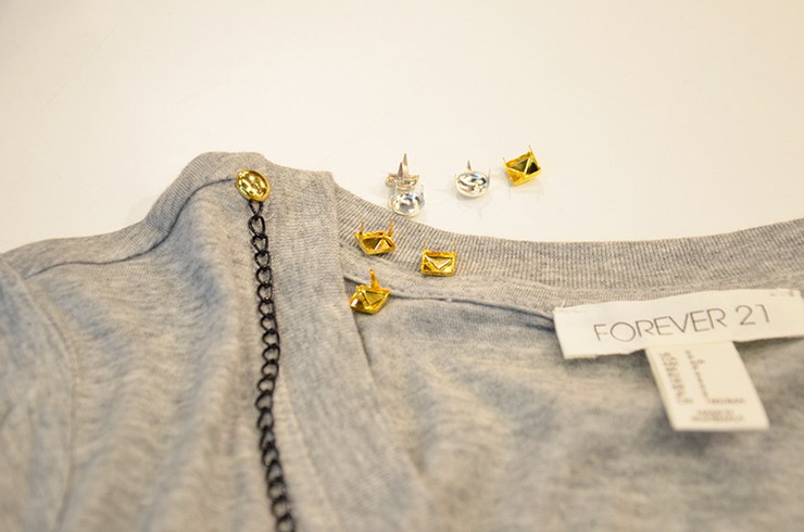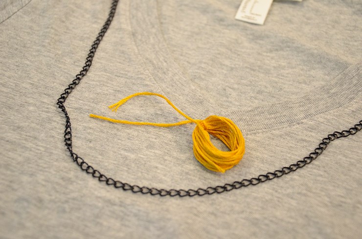 Pour la longueur de la chaine c’est à vous de voir, j’aime en garder environ 50 cm pour un effet sautoir. Pour éviter de coudre j’utilise deux clous pour attacher ma chaine au tissu. Il suffit de rabattre les griffes du clou à l’intérieur du tissu. Vous pouvez coudre la chaine également.