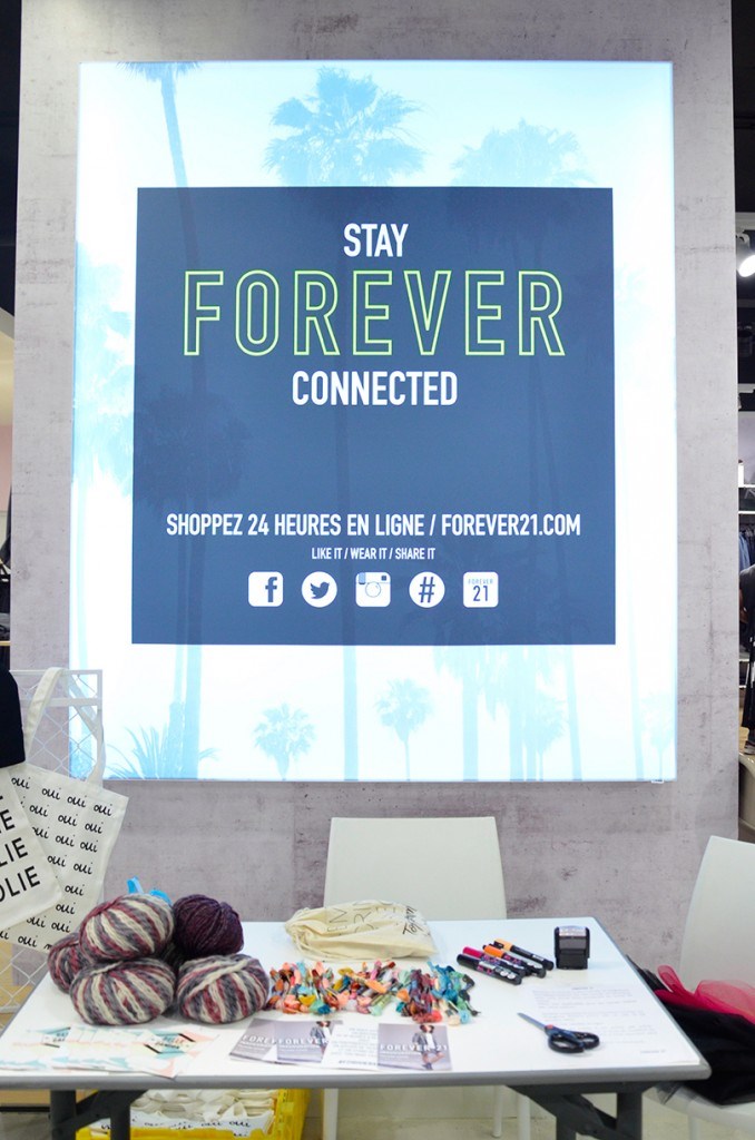Pour tous ceux qui n’ont pas pu se rendre à Cagnes-sur-mer pour l’ouverture de la boutique Forever21 (dans le centre commercial Polygone Riviera) voici quelques photos de cette super journée et les DIY réalisés avec vous. C’était génial de vous rencontrer autour d’un do it yourself. Merci d’être venues jusqu’à moi! Comme d’habitude des customisations simples pour vous donner envie de personnaliser vos accessoires. Ici un pompon tout doux pour votre bonnet, un collier à ajouter à votre top et un tote bag revisité.