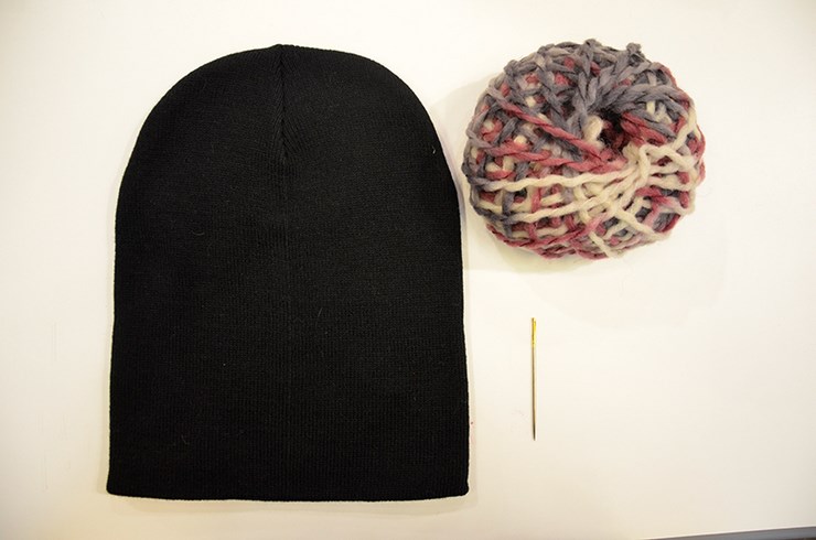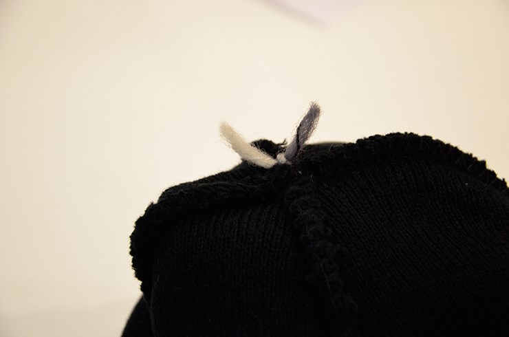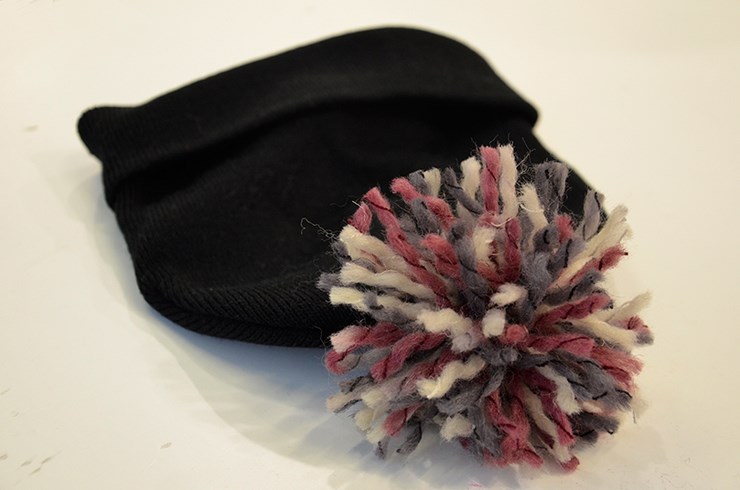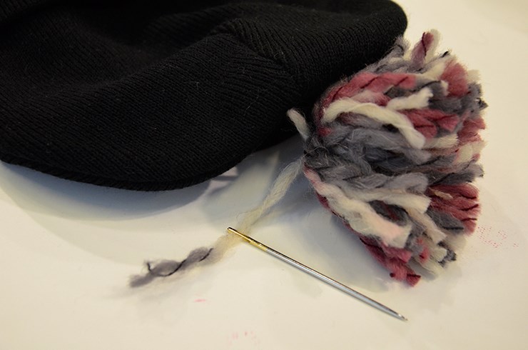 Ces deux fils de laine vont vous servir pour attacher le pompon au bonnet. Avec la grosse aiguille faites passer les fils à l’intérieur du bonnet. Positionnez le pompon au sommet du bonnet !