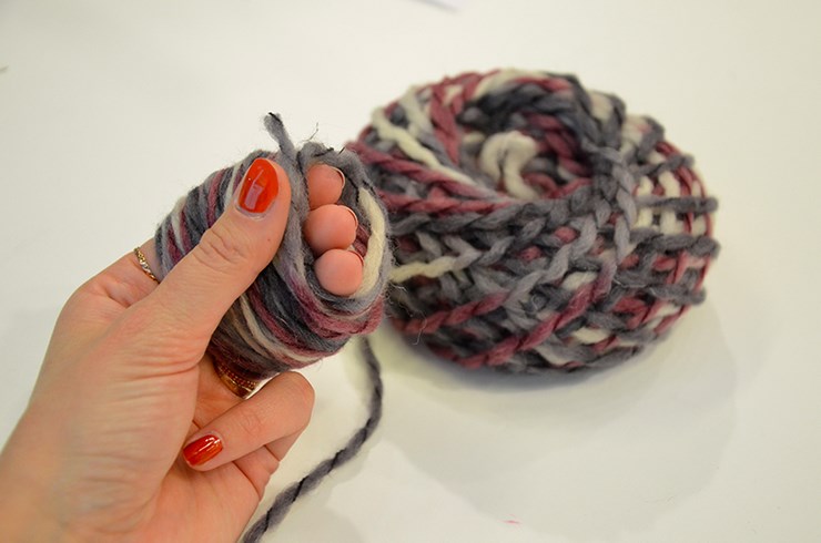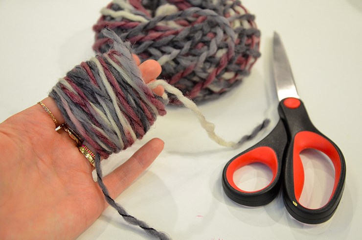 Découpez le brin de laine quand vous avez terminé puis découpez 20cm de plus. Passez ce morceau dans l’ensemble, entre vos doigts et faites un nœud bien serré et solide.