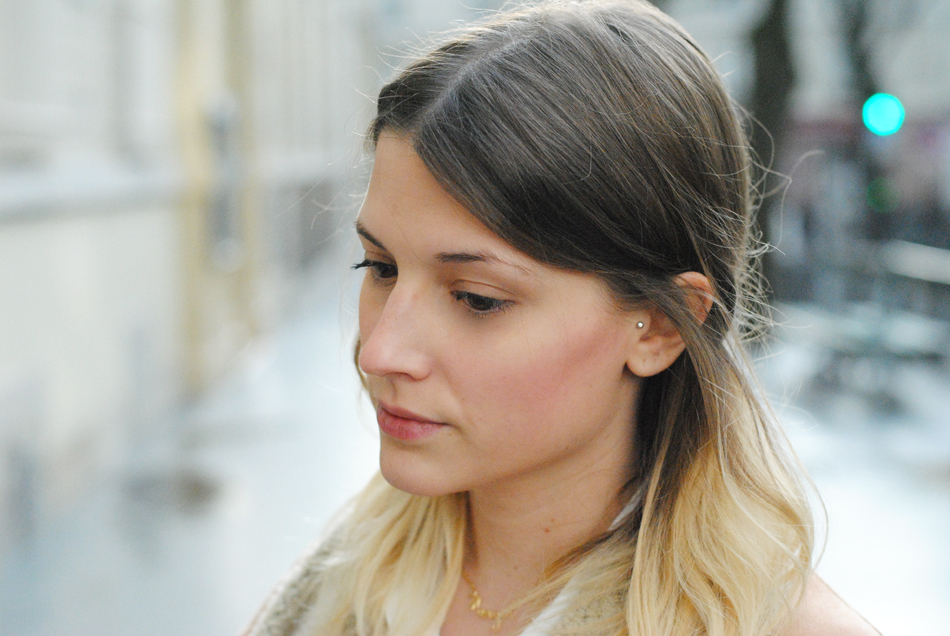Fond de teint (010 Light Beige) Catrice, poudre mate (010 Transparent) Catrice, correcteur Catrice, mascara « faux cils papillon » L’Oréal Paris, encre à lèvres L’Oréal Paris (Lolita) et blush « Hervana » Benefit.