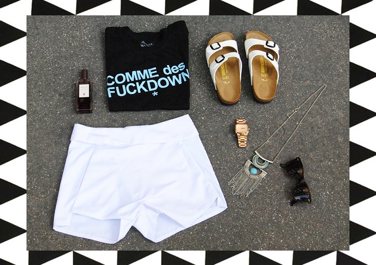 Un short asymétrique (vous connaissez déjà la version noire, j’ai craqué cette fois sur le modèle blanc), mes Birki vernis et blanche, mon nouveau parfum Serge Lutens (la toute dernière fragrance : La fille de Berlin. Je portais jusque là Sa majesté la rose. Cet autre parfum toujours à la rose est un délice poudré) et quelques accessoires pour souligner cette tenue.