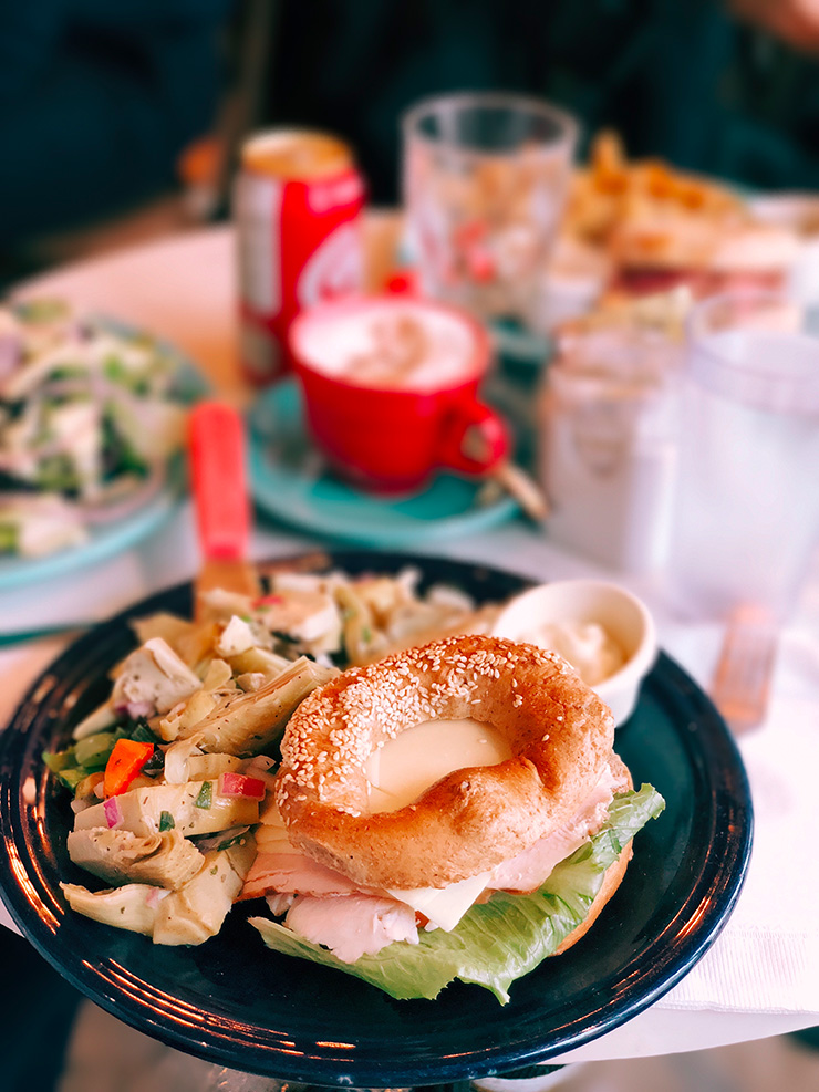 C’est un peu l’institution du bagel à Montréal. Vous retrouverez plusieurs restaurants pour déguster un bon bagel. Ici j’avais commandé un bagel au pain complet, dinde, fromage, laitue… et en accompagnement une belle salade d’artichauts.
