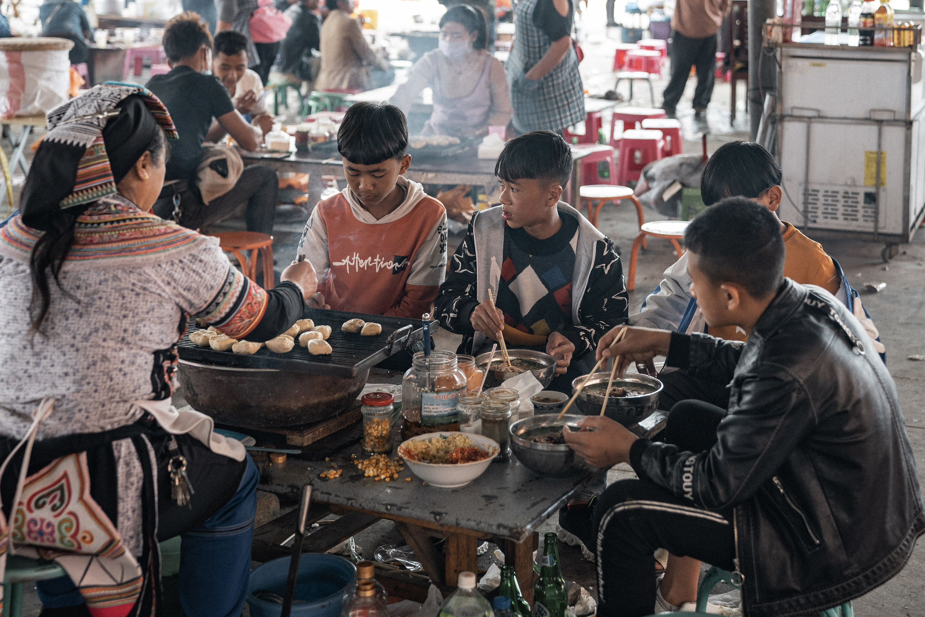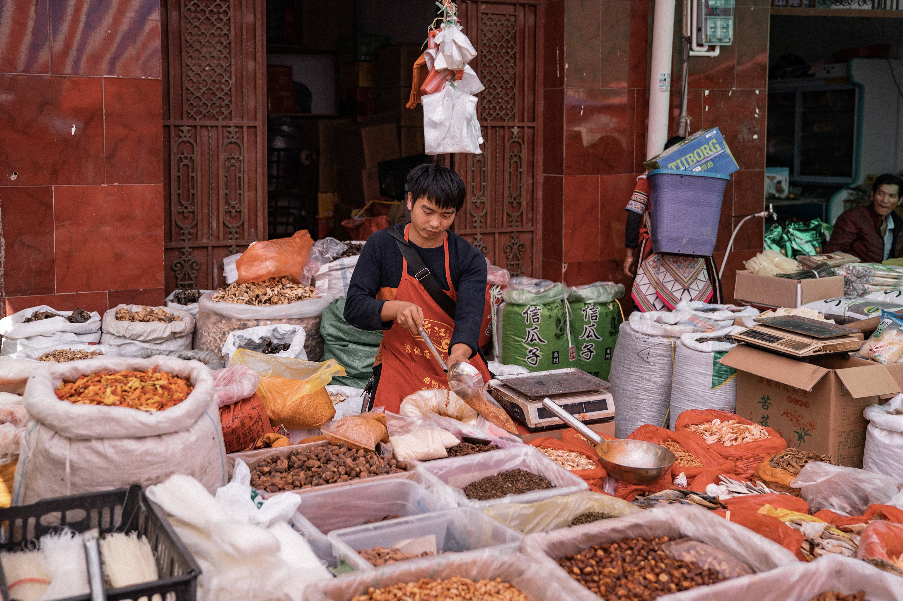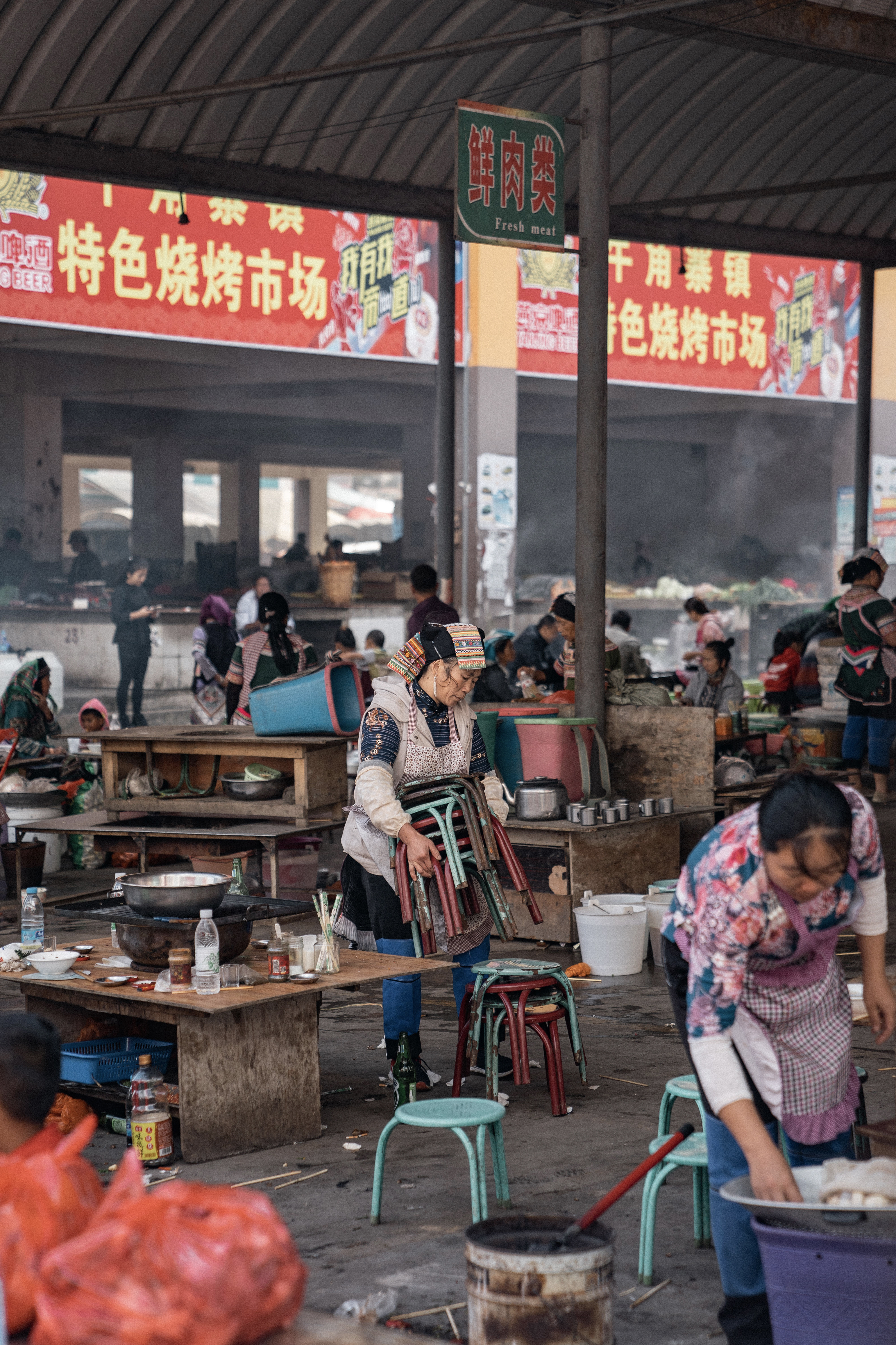 Le lieu est animé mais la partie viandes est vraiment difficile à traverser, je vous passe les détails. Le plus chouette est de voir les tibétaines porter la coiffe et l’habit traditionnel pour vendre ou acheter des légumes.