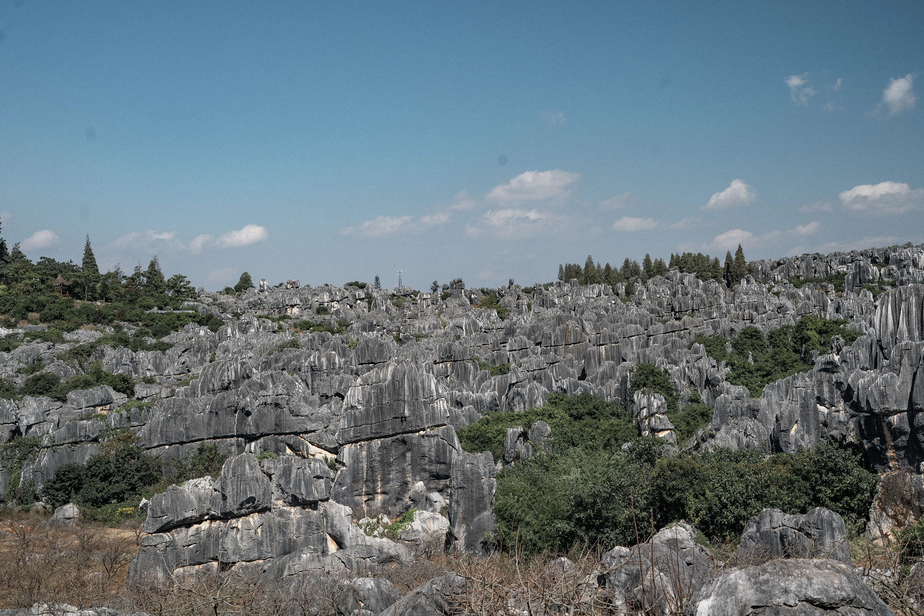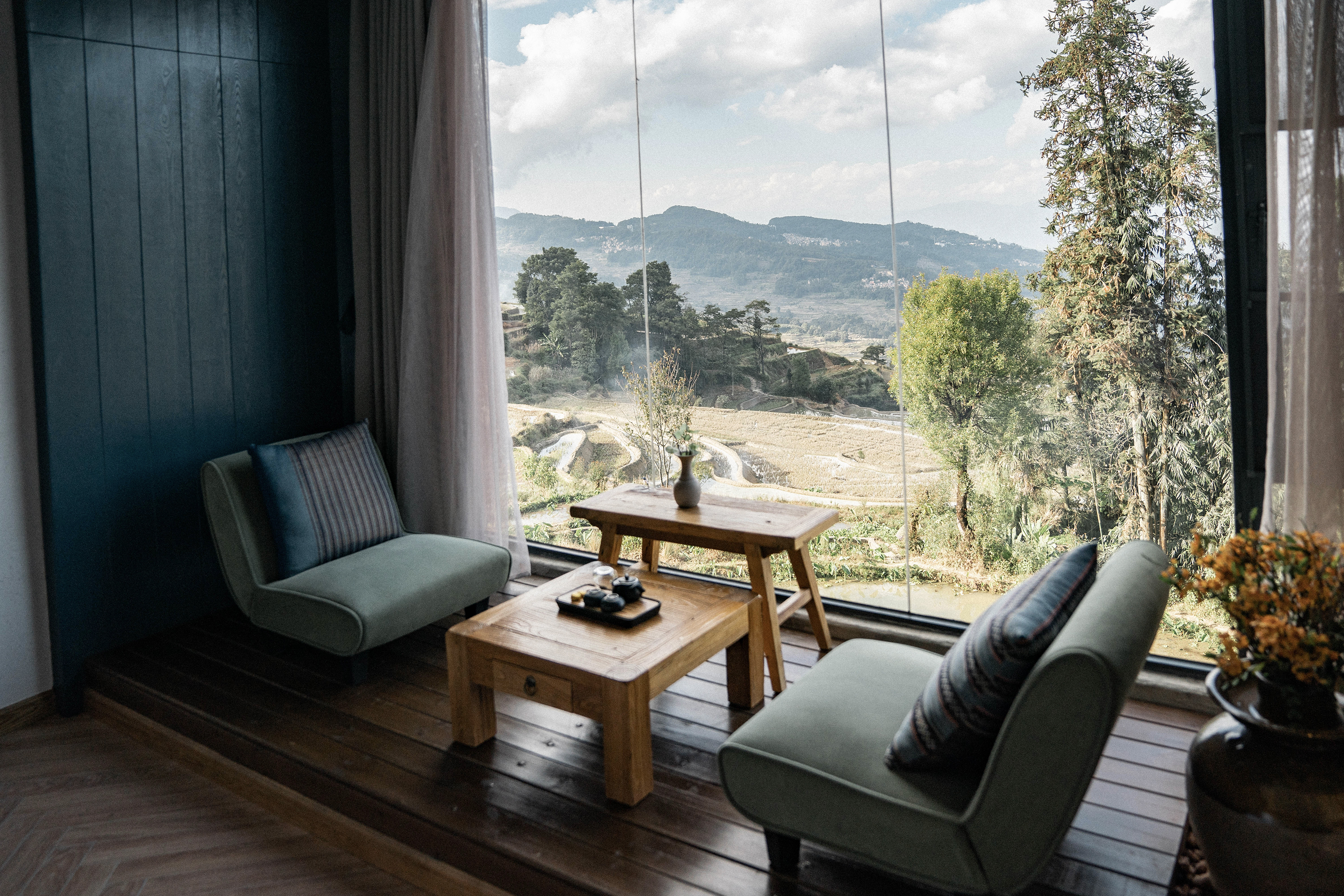 L’entrée du parc était à 5€/personne et une navette nous a conduit jusqu’au point de départ de la rando. Nous avons déjeuné là, à la Tea horse guesthouse (auberge et restaurant) juste avant de démarrer.