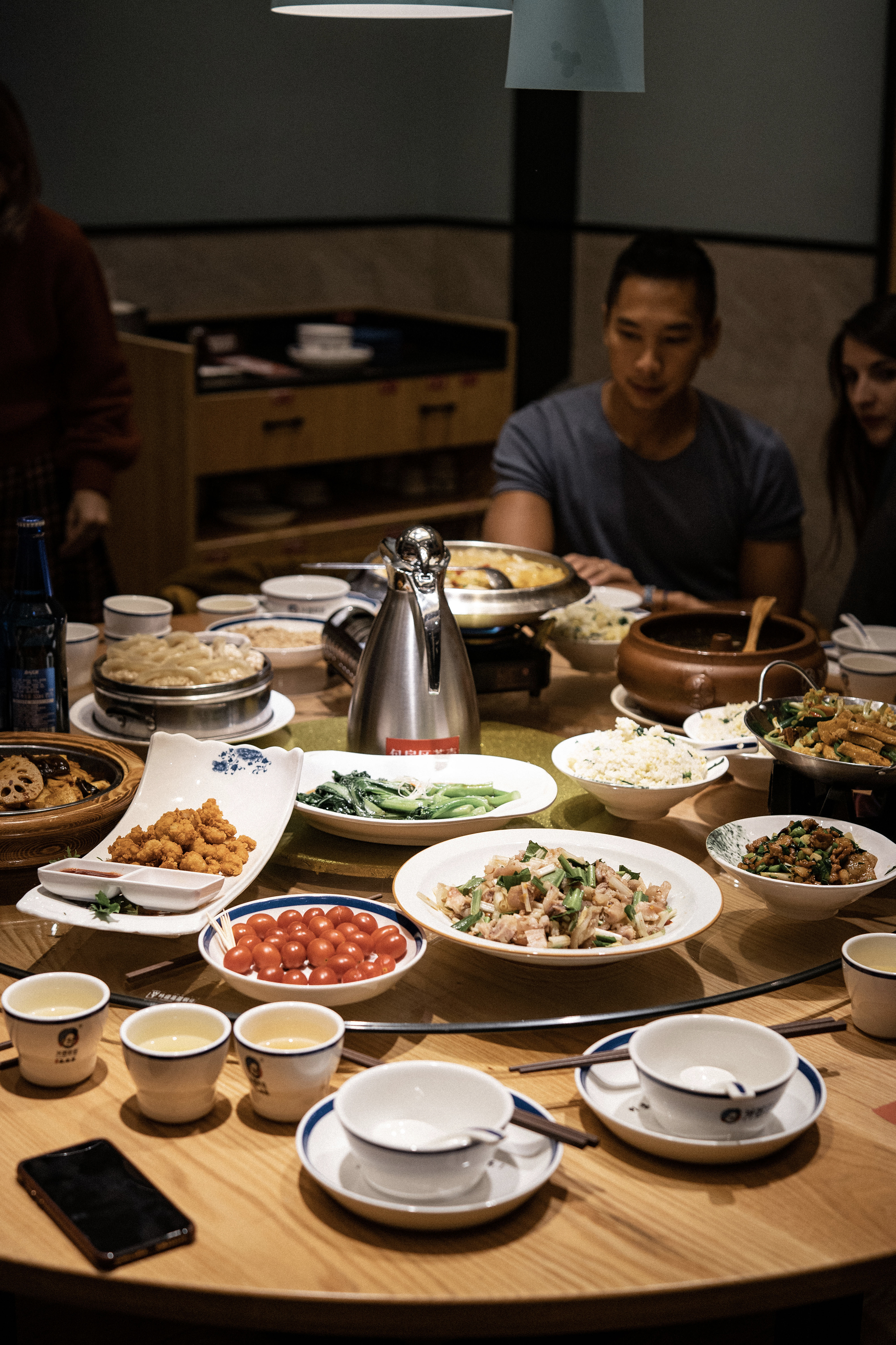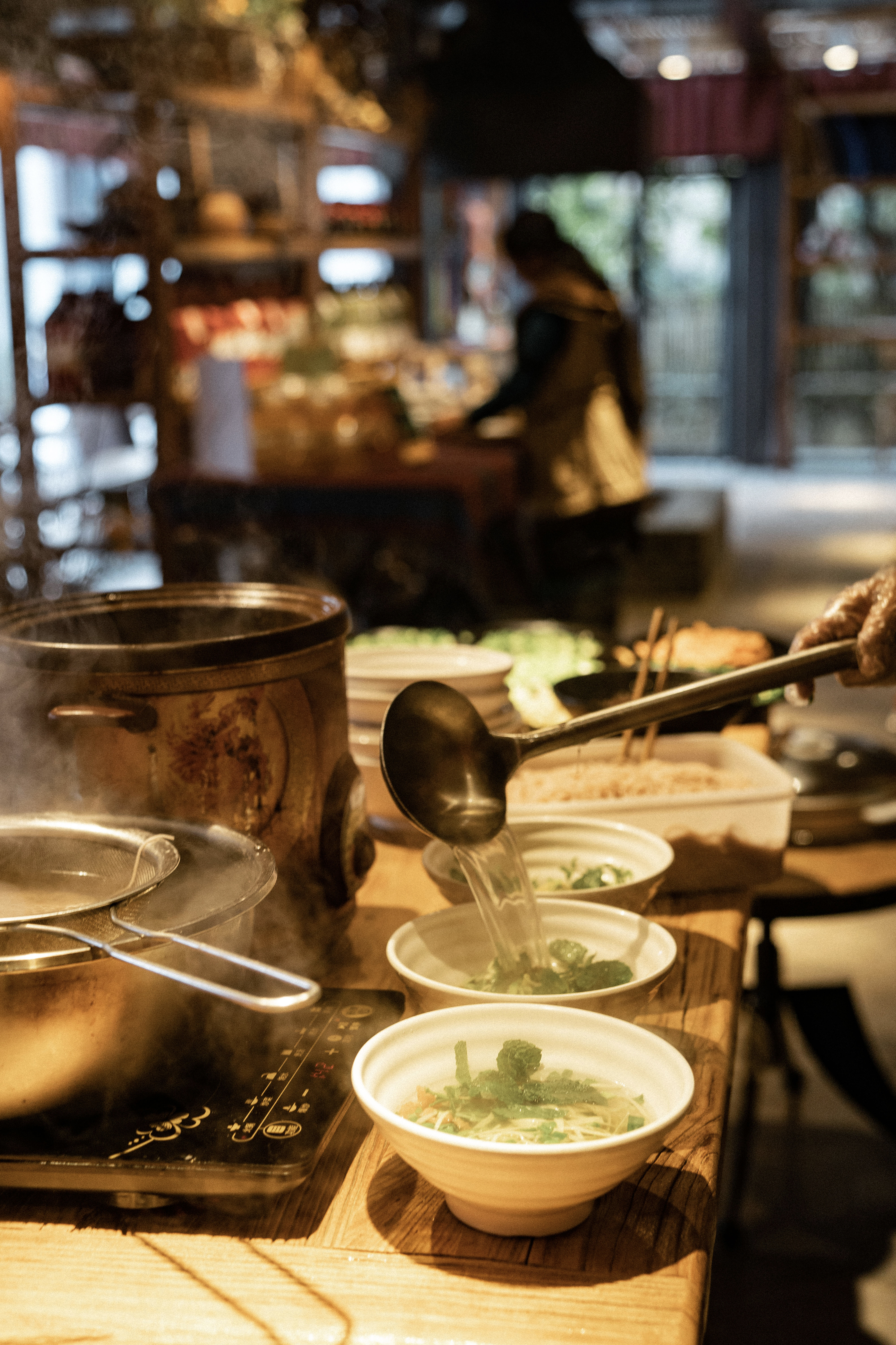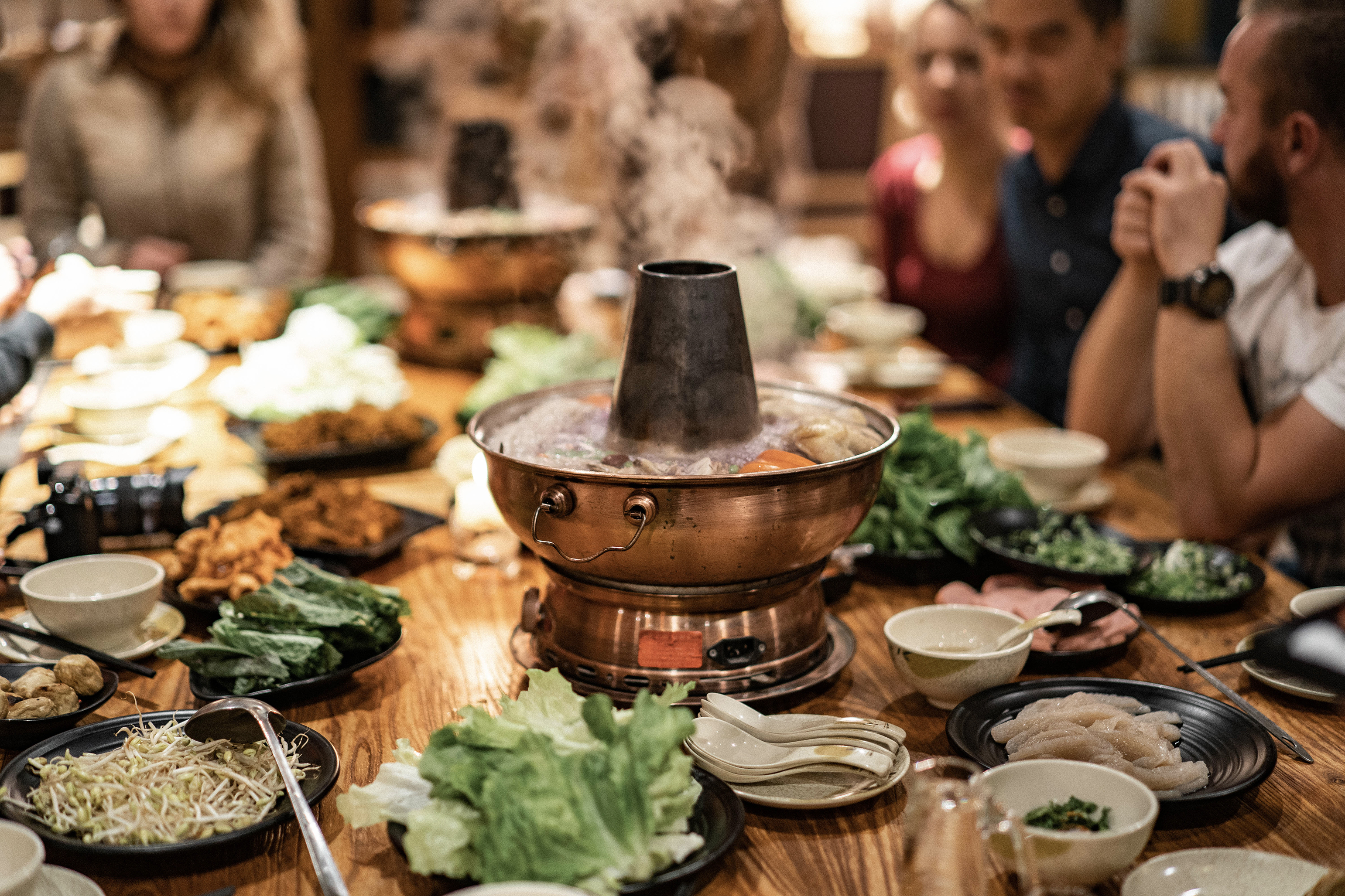 Pour le dîner nous avions réservé au restaurant de l’hôtel un hot pot ! Une grand bol de bouillon fumant avec de nombreux accompagnements à faire cuire soi-même directement à l’intérieur. Légumes, tofu, poissons, viandes, salades, soja, cacahouètes… délicieux !