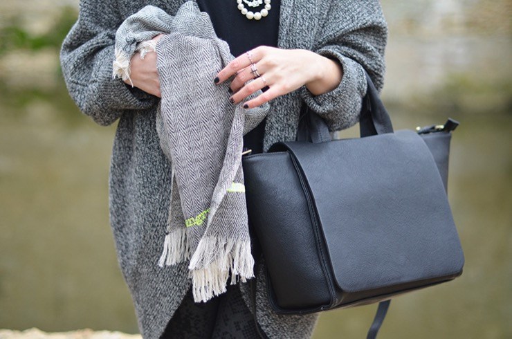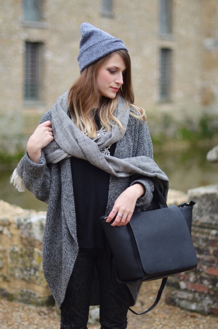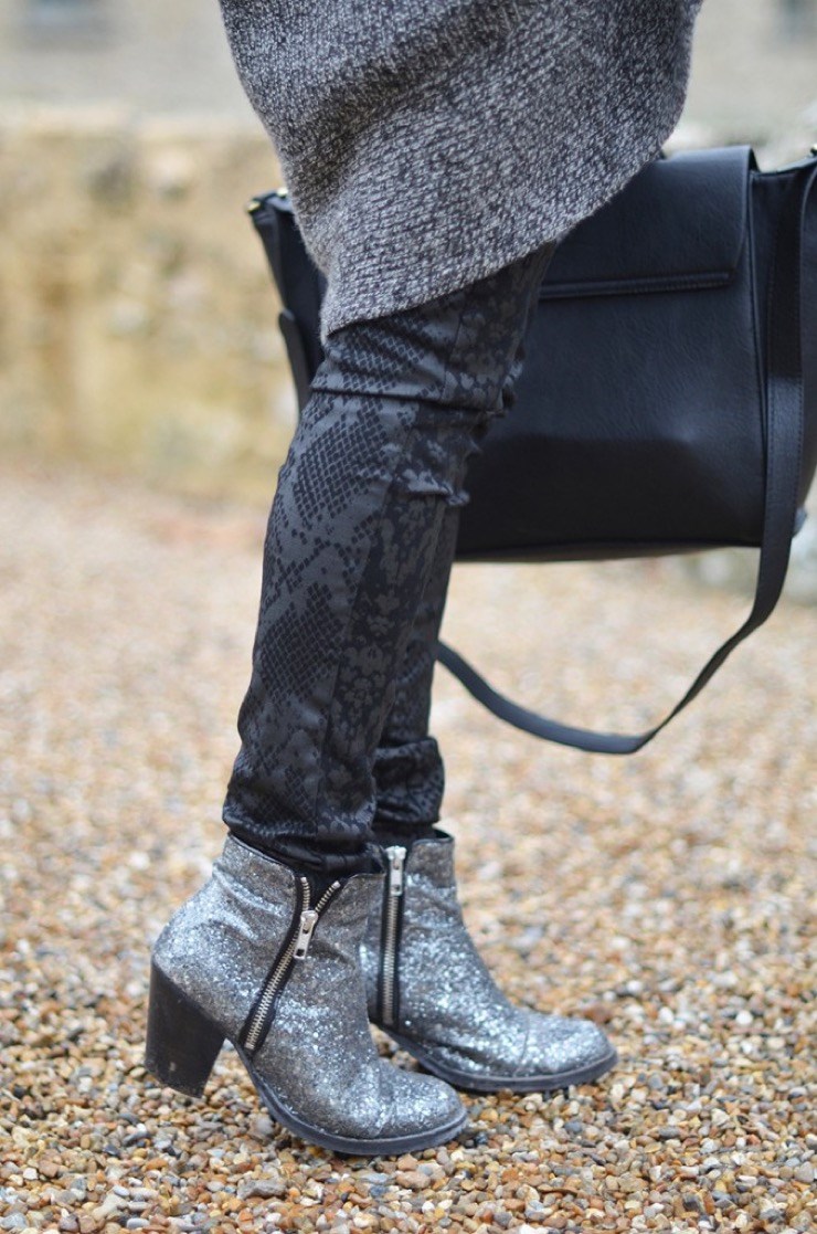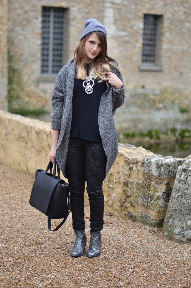 Bonnet Primark, gilet Uniqlo, top et sac Zara, collier New Look, pantalon Cimarron, écharpe Khadi and co (broderie via Bohemian-chic) et boots paillettes Topshop (disponibles de nouveau).