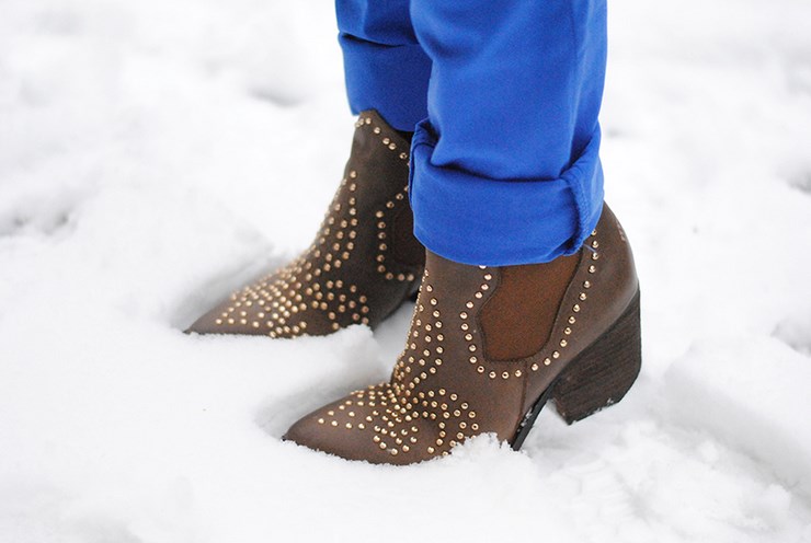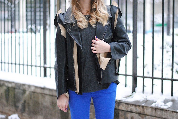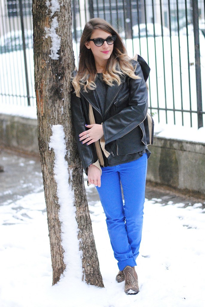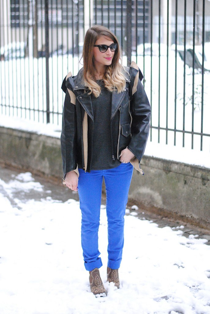 J’ai associé cette veste avec un slim bleu électrique qui ressort à merveille dans ce décor enneigé 😉