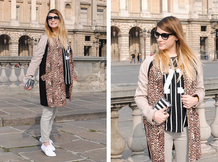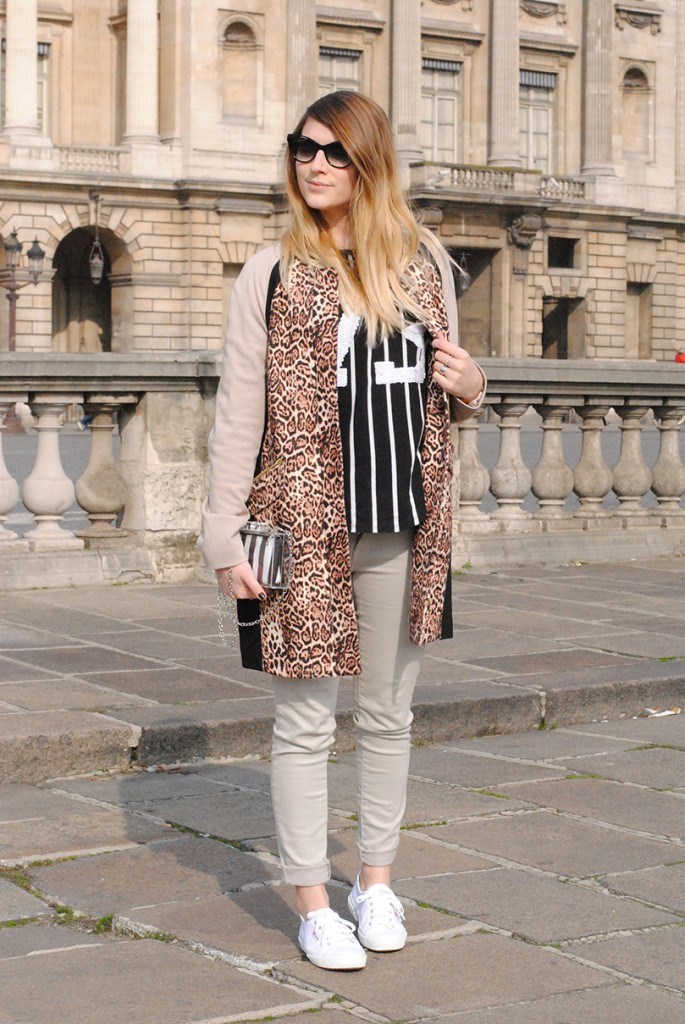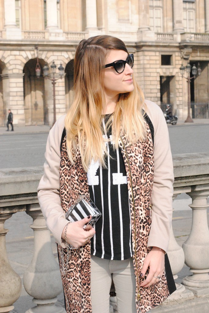 En imaginant cette tenue j’avais beaucoup hésité. Merci à celles qui m’avaient donné leurs avis sur Instagram. J’ai eu envie de mixer les motifs léopard de ma veste longue avec les rayures de ce top sport. Pour ma part, j’aime le résultat.
