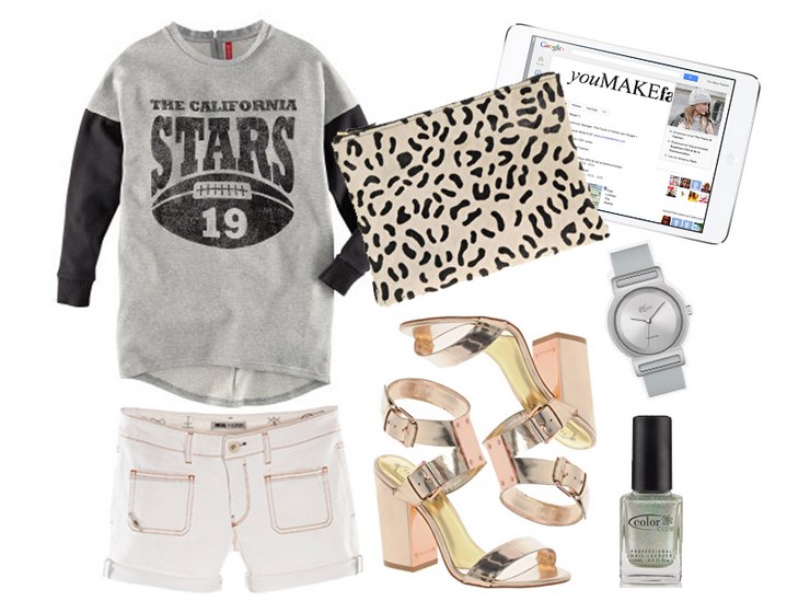 Top long H&M, short Diesel + Edun, pochette ASOS, sandales Ted Baker, montre Lacoste Live, vernis holographique Color Club