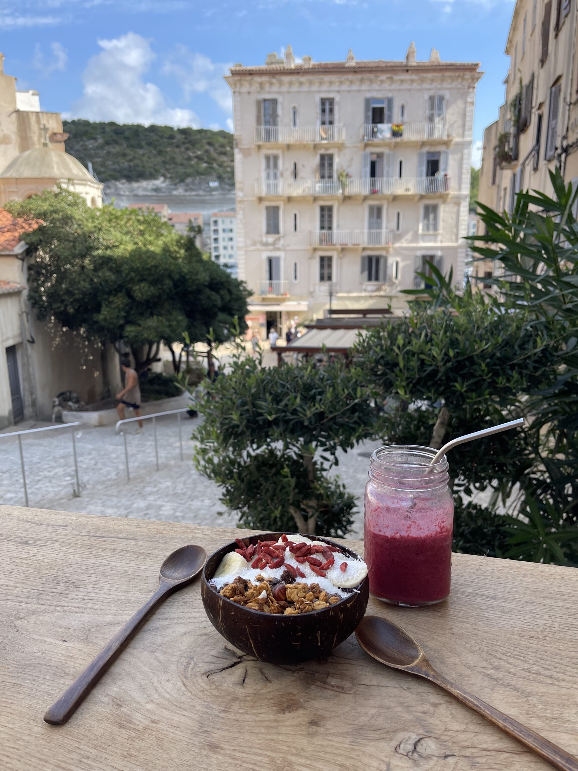 Petit dej au Sampiero Corso (l’hôtel appartient aussi à U Livanti). Buffet les pieds dans l’eau, la vue était incroyable. Fromages corses, gâteaux et pancakes maison, fruits, pains, céréales, jus… 14€/personne. Un bon plan, même si vous n’avez pas dormi à l’hôtel.