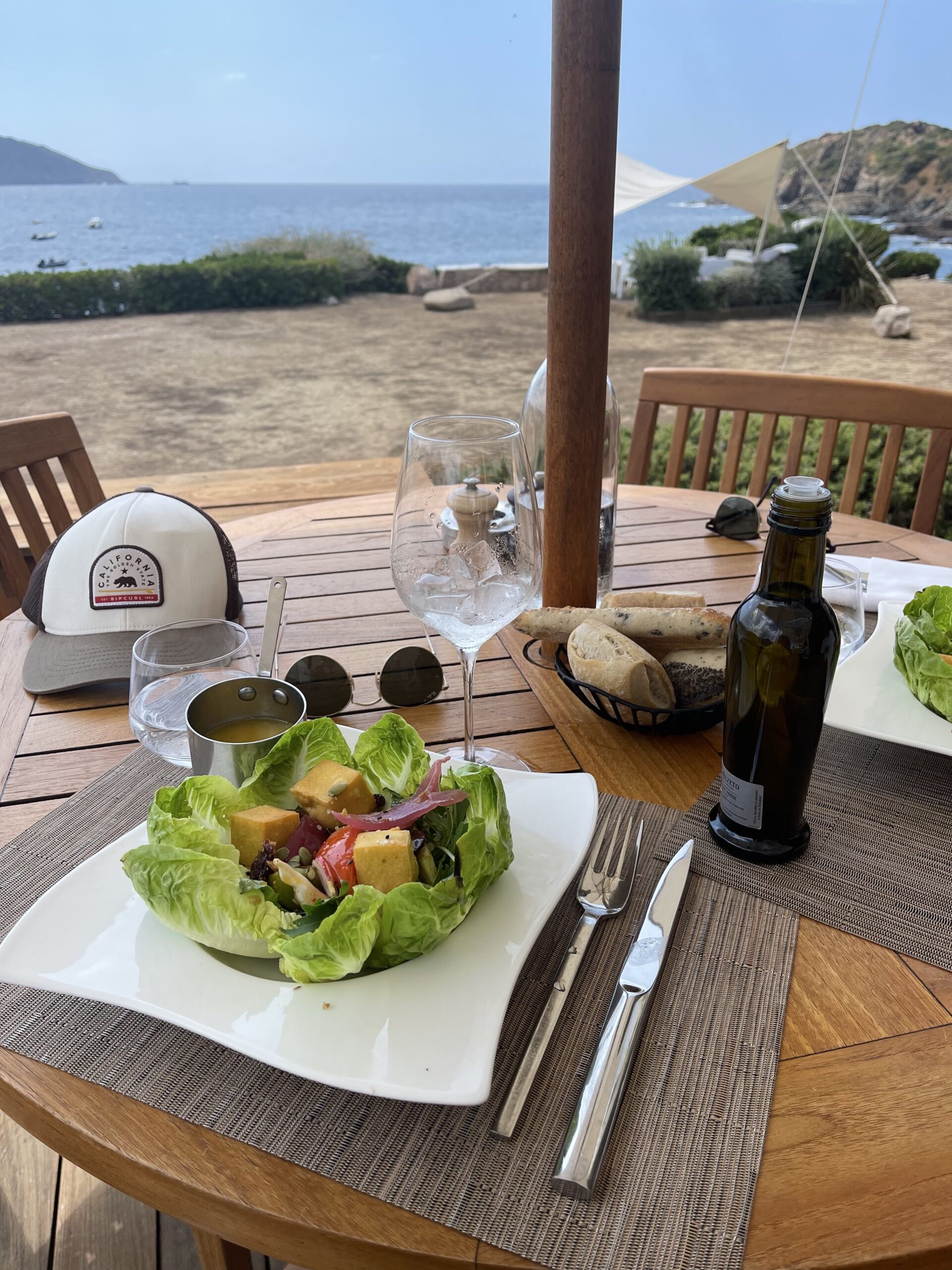 Nous avons dîné au restaurant de l’hôtel en arrivant le dimanche soir et c’était délicieux. Œuf parfait, velouté de petit pois à la menthe, espadon (cuit à la perfection) et dessert au chocolat. C’était parfait, tout ça avec un coucher de soleil panoramique… quelle belle soirée. Je vous conseille de venir dîner ou prendre le petit déjeuner par exemple (16€/personne).