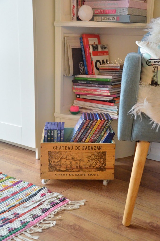 J’ai toujours mille petites choses qui trainent mais que je n’aime pas voir étalées partout. En même temps elles n’ont pas vraiment de place autre part. Du coup je suis toujours à la recherche de boites, de vides poches… et un de mes alliés dans cet appartement c’est cette caisse à vin que j’ai customisée. Elle est hyper pratique grâce à ses roulettes et peut contenir beaucoup de choses ! En ce moment ce sont mes DVD Disney. Je vous laisse avec la vidéo si ce DIY déco vous intéresse.