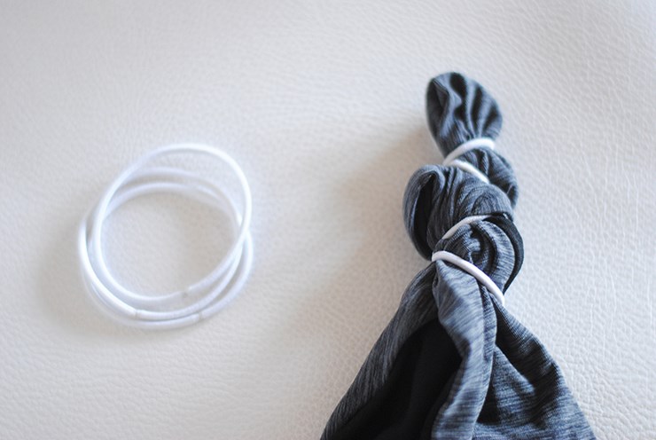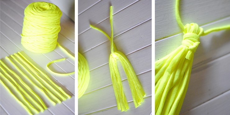 Terminer la customisation avec des pompons. Pour se faire : découper 8 morceaux de Hoooked de 30 cm chacun. 6 d’entre eux serviront à la création du pompon, il suffit de plier en 2 les morceaux ensemble. Le 7ème sellera l’ensemble. Il suffit de nouer les 6 fils et de faire un noeud. Le dernier servira d’attache, une fois le fil passé dans la boucle. Le nœud de l’attache doit être caché dans la boucle du pompon.