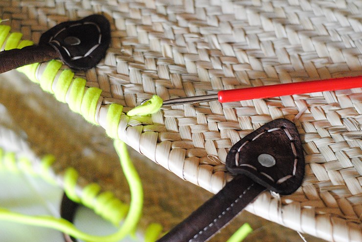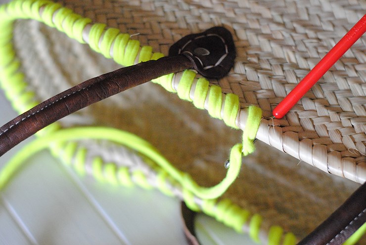 Faire un nœud à l’intérieur et tisser le fil dans l’osier à distances égales en le croisant dans le crochet 2 fois. Faire le tour du panier et terminer par un nœud.