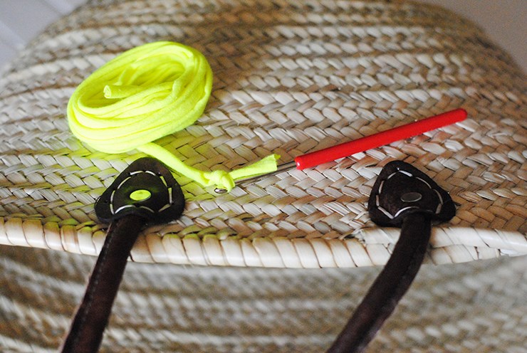 Le hoooked Zpagetti est une nouvelle matière, une bobine de jersey créée à partir de chutes de tissus recyclés. Ici le fil sera utilisé pour broder le contour du panier et réaliser des pompons.