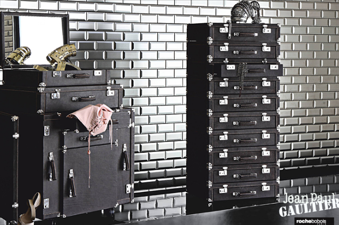 1 octobre 2010Pour ses 50 ans Roche Bobois invite Jean Paul Gautier à designer une série de meubles salon et chambre à coucher. Des meubles décalés mais portant une forte signature du couturier. Les canapés sont habillés en marinière, les tapis portent des pompons, les draps sont rose poudre, le fond de l’armoire est tatouée (tatouage: coup de coeur de JPG), et la dentelle sérigraphiée est omniprésente.