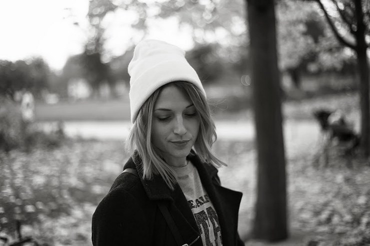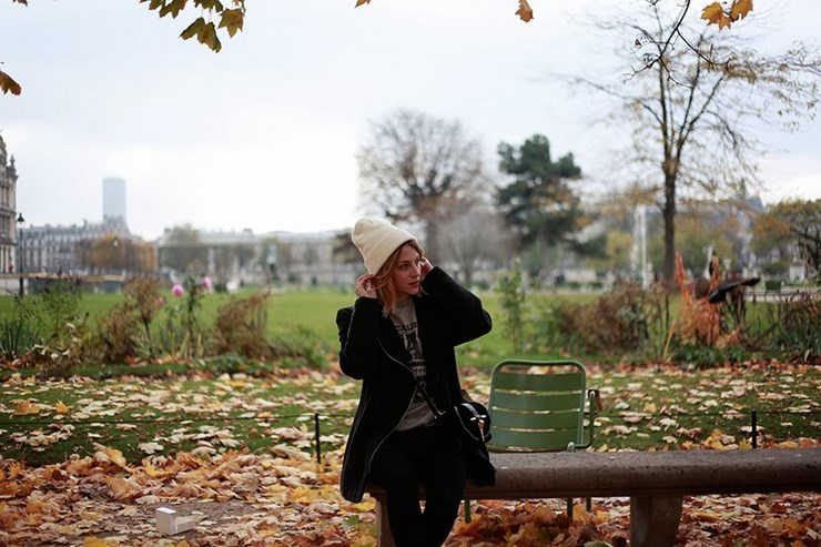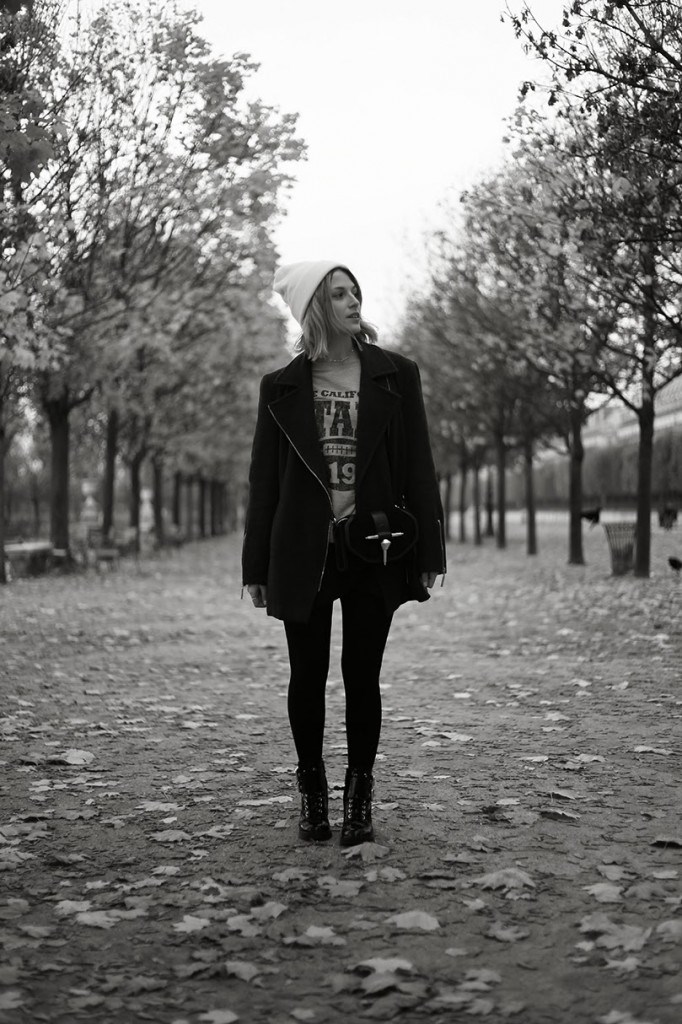 Manteau Vintage (similaire ici), sweat H&M, short Zara, collants New Look, boots Guess, sac Zara (similaire ici et ici) et bonnet American Apparel.