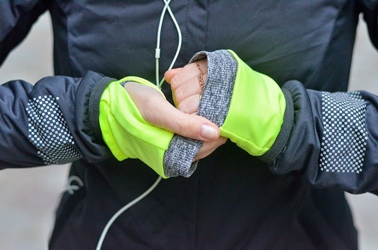 Cet hiver j’ai opté pour un pantalon réfléchissant. Il se révèle avec les flashs ou les phares et ça me rassure. Pensez de nuit à courir au moins avec un ou deux brassards fluo. J’ai aussi adopté cette veste avec des mitaines intégrées. Je vous conseille vraiment les mitaines si comme moi vous avez froid aux mains pendant vos sorties. Rien de trop épais mais quelques chose qui vous recouvre une bonne partie des mains.