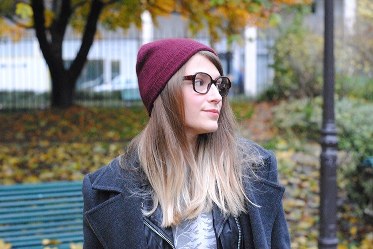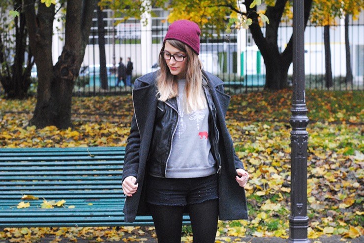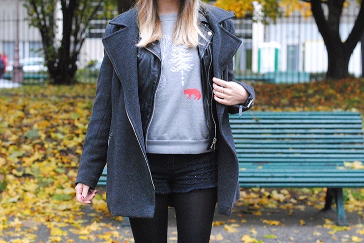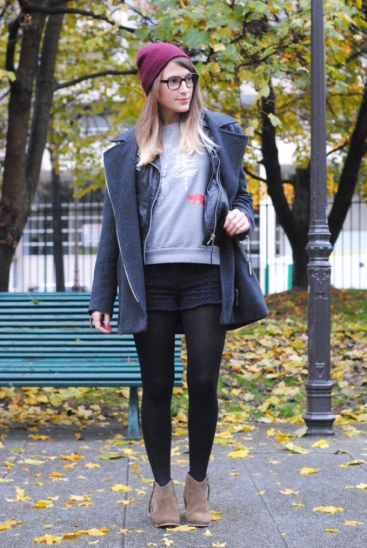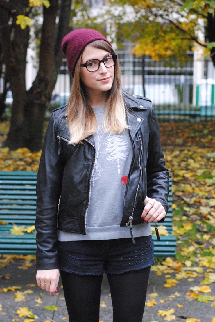 Bonnet H&M, manteau Vintage, perfecto La Canadienne, sweat from London, short New Look et bottines La Halle aux Chaussures.