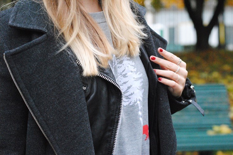 Ce look renferme tout un tas de trouvailles. Ce manteau, ramené de Saint Jean de Luz qui appartenait à ma grand-mère. Ce sweat, que ma coloc’ Londonienne portait ado. Ce perfecto, mon tout premier blouson en cuir noir. Et cette paire de chaussures, trouvée chez La Halle. Je cherchais des boots comme ça depuis des années : simples, courtes, zipées, plates et surtout en cuir. Et le petit plus sur celles-ci que j’adore : les lanières de cuir sur les zips !
