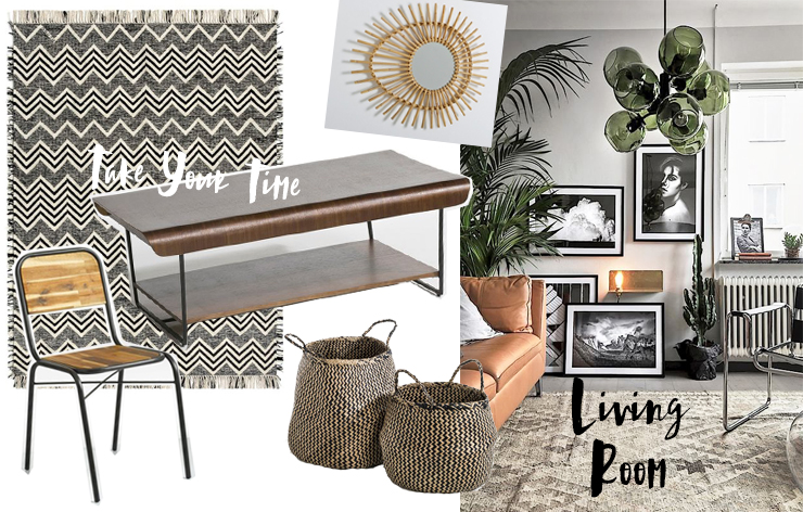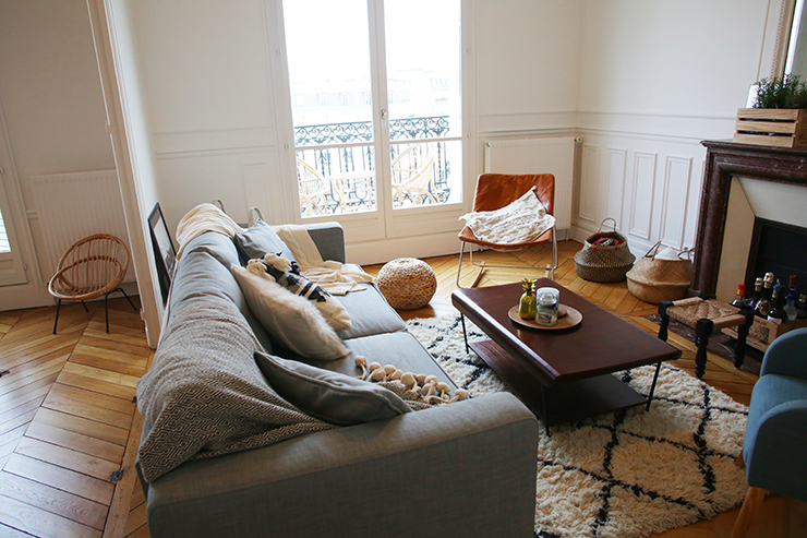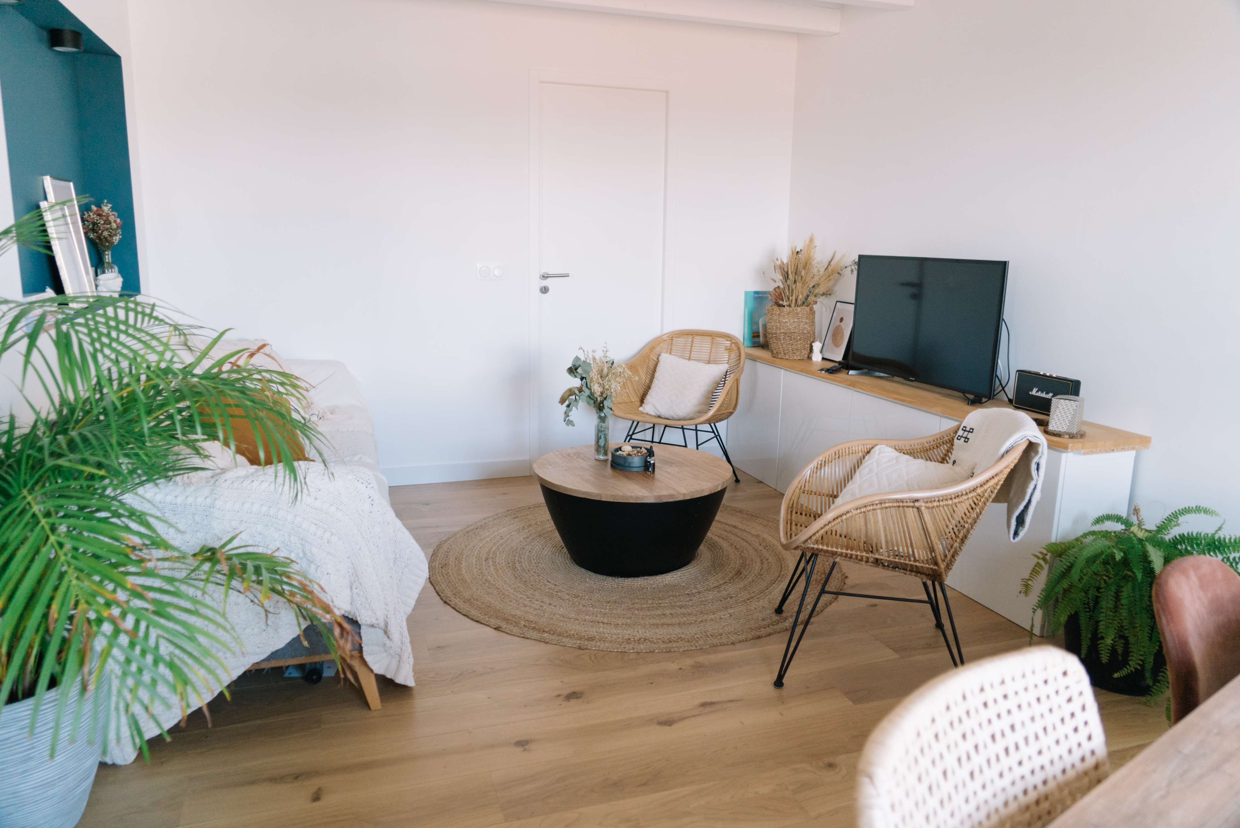Canapé Maisons du monde, table basse et fauteuils La Redoute, meuble TV IKEA avec planche sur mesure Leroy Merlin par dessus