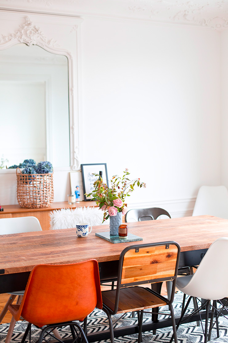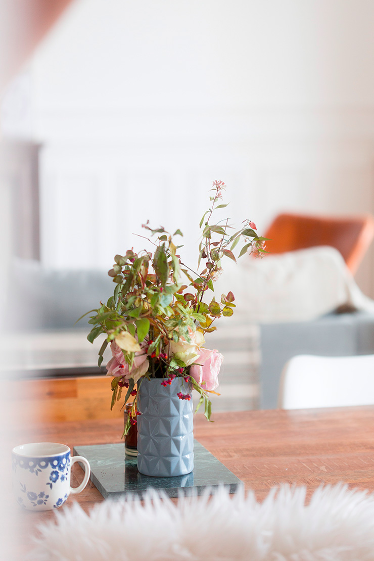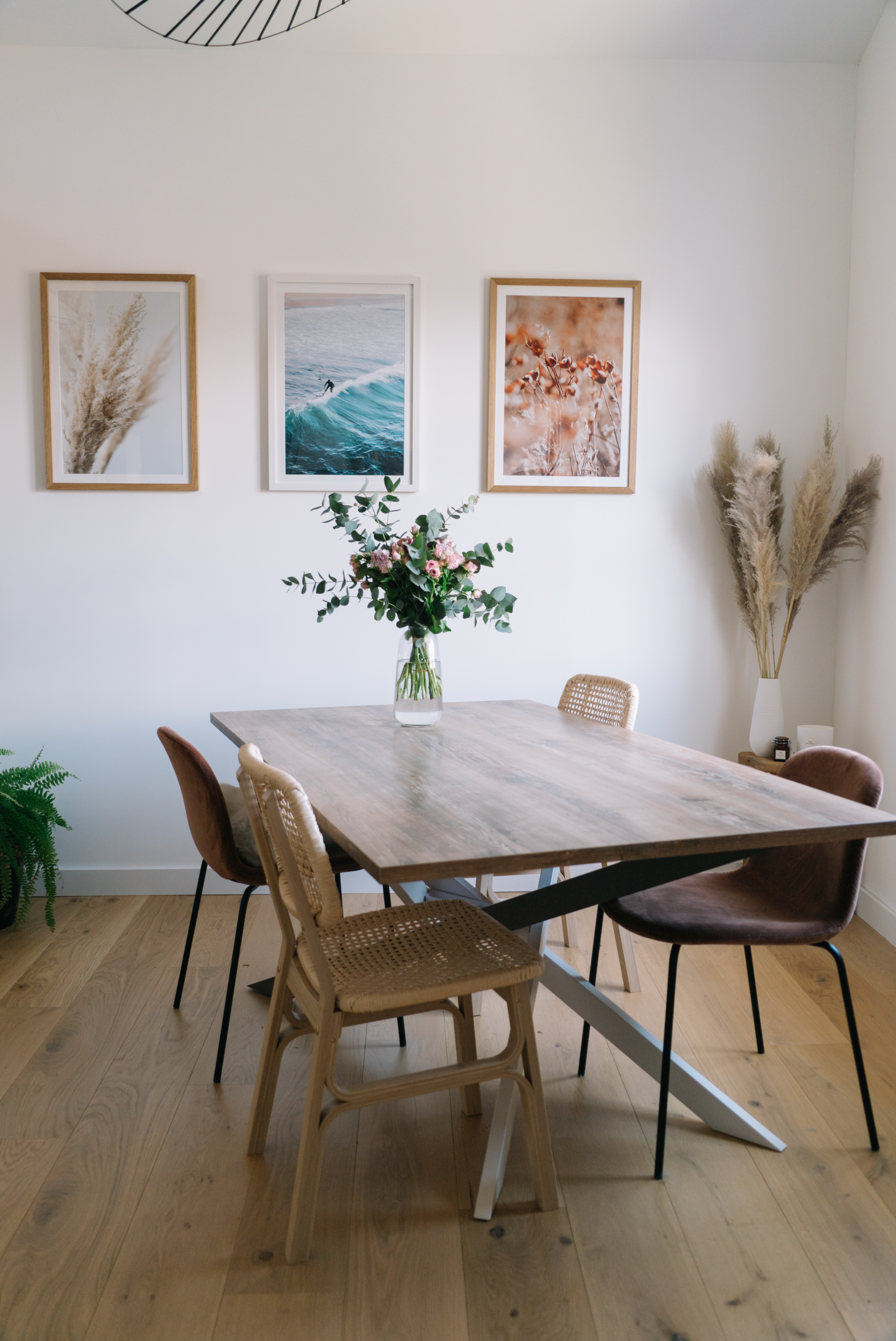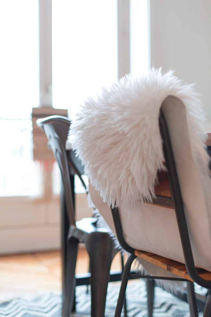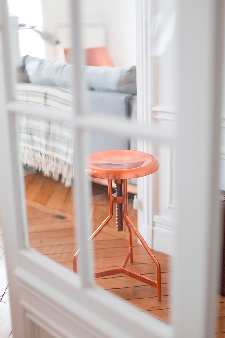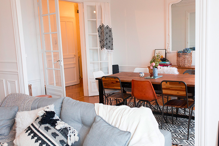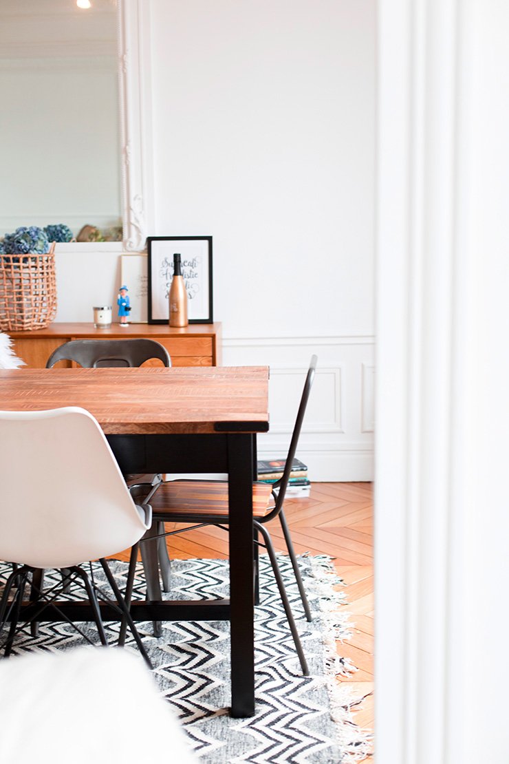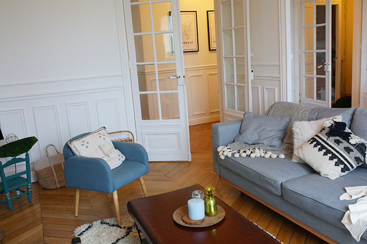 Je ne souhaitais pas changer les meubles de cet appartement joliment meublé, exceptées les chaises. Il s’agit donc de petites décorations, avec la contrainte des murs bleus. Et moi qui avait envie de terra cota et de rose, je suis conquise !