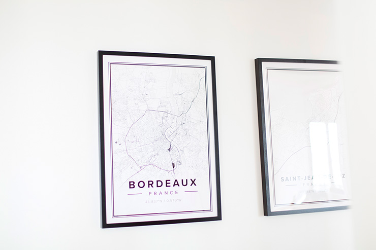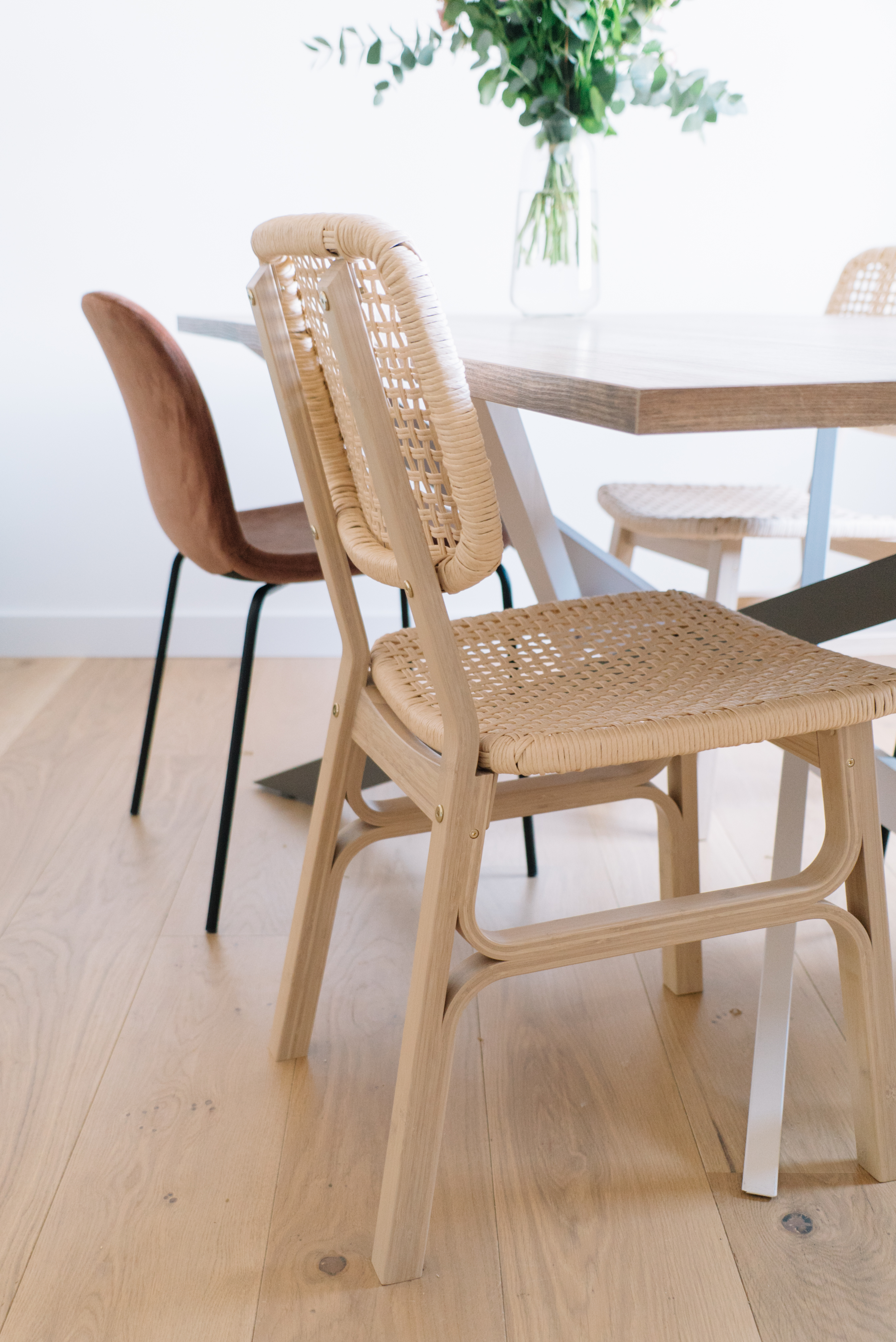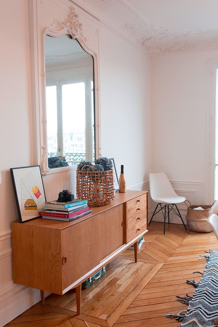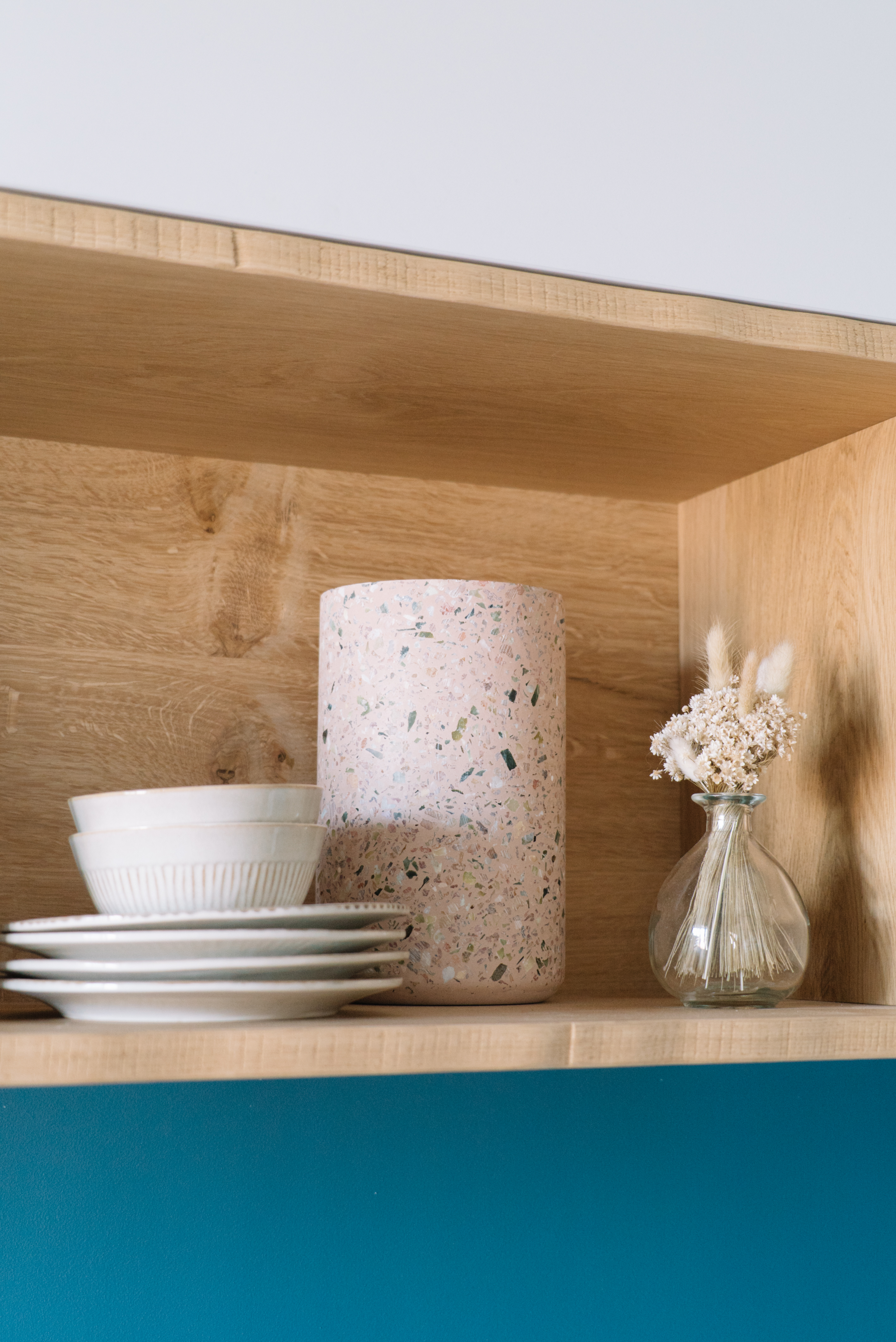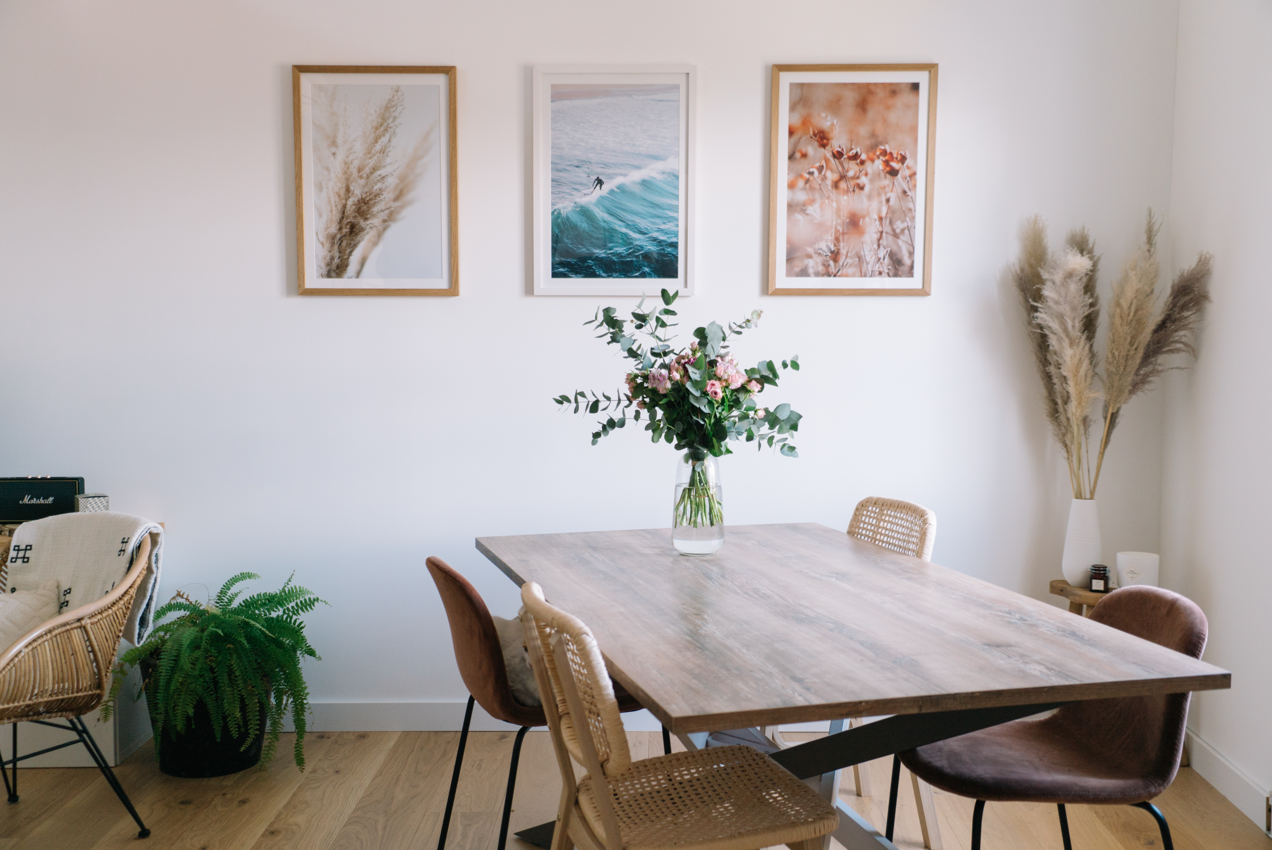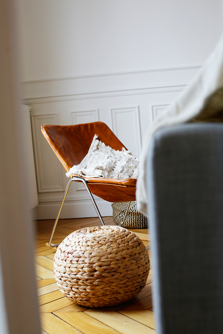 Je ne souhaitais pas changer les meubles de cet appartement joliment meublé, exceptées les chaises. Il s’agit donc de petites décorations, avec la contrainte des murs bleus. Et moi qui avait envie de terra cota et de rose, je suis conquise !