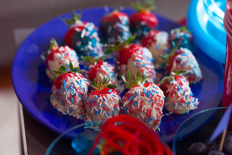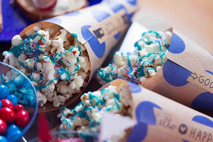 Recette 2 et 3 : pop corn, fraises,chocolat blanc, paillettes HEMA, colorant bleu