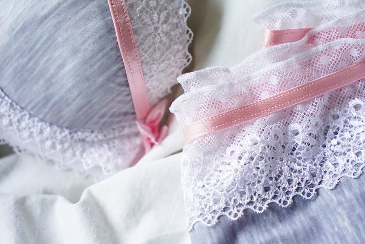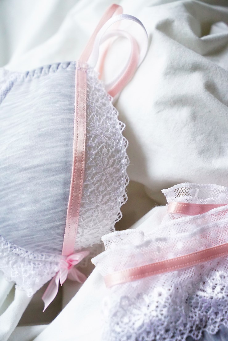 J’ai eu la chance de me prêter au jeu et je peux vous dire que l’exercice est super excitant. Tout est possible, alors moi qui suis indécise…. Mais je suis ravie de ma parure. J’ai choisi un tissu gris effet chiné, de la dentelle blanche, des détails roses clairs et blancs et un noeud à rayures.