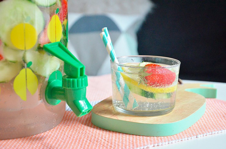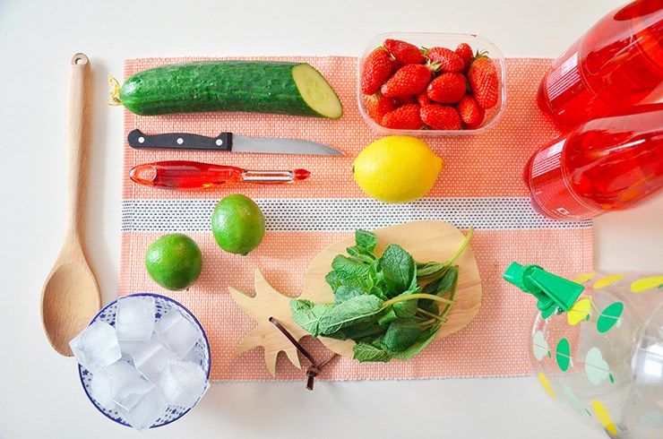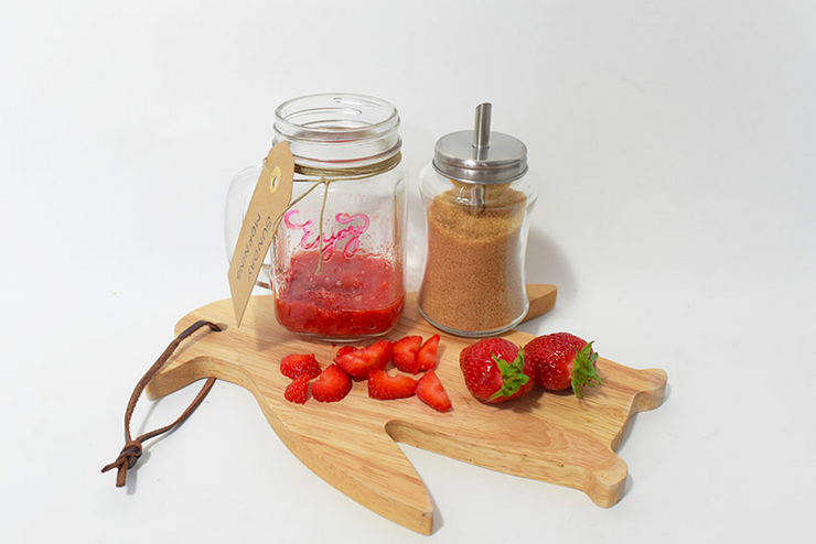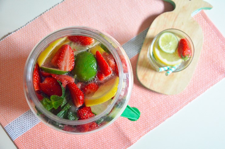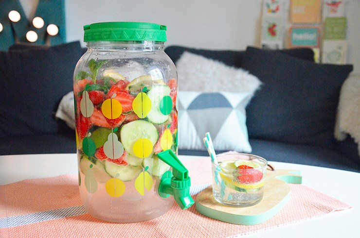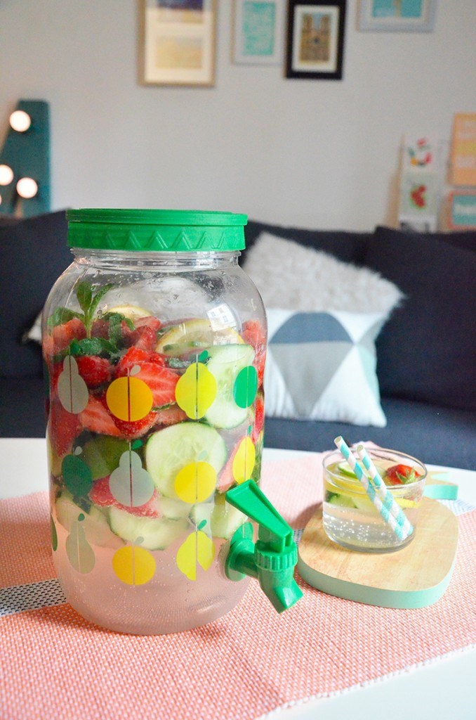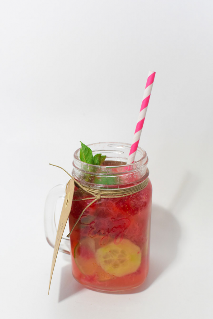 Dans le bocal écrasez 6 belles fraises avec une cuillère à soupe de sucre de canne. Ajoutez le jus d’un demi citron vert, des tranches de concombre, des glaçons et mélangez. Versez de l’eau gazeuse et ajoutez une fraise entière puis de la menthe fraîche.