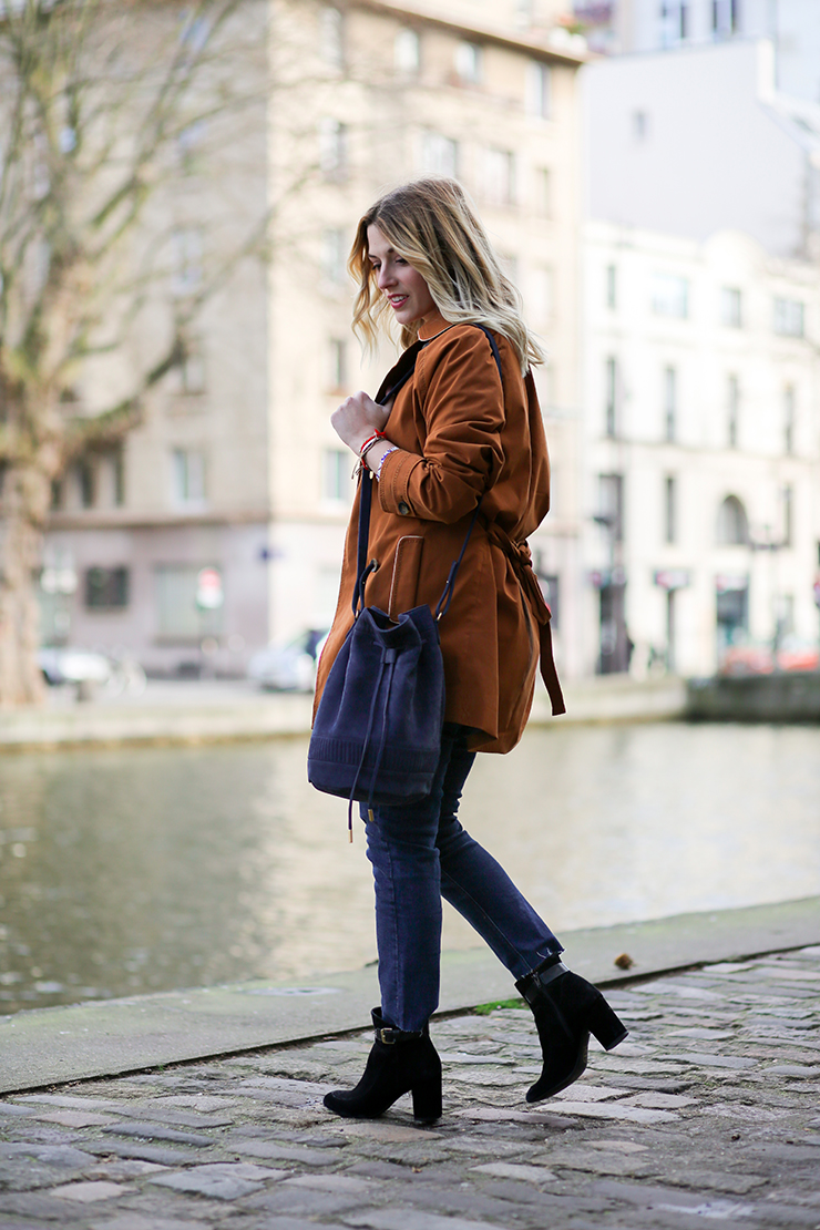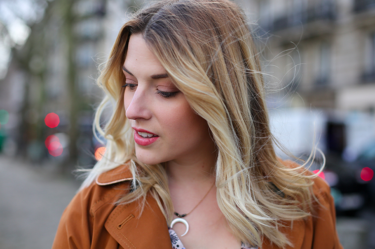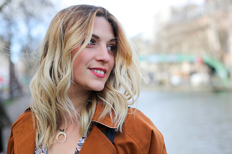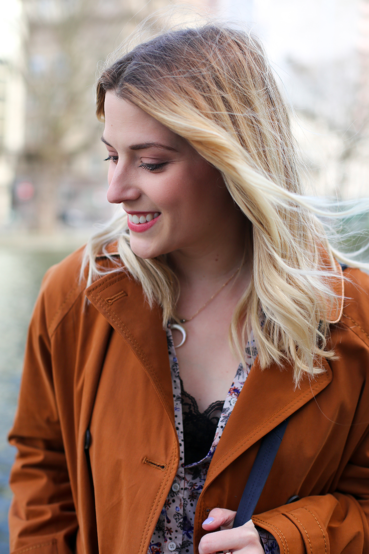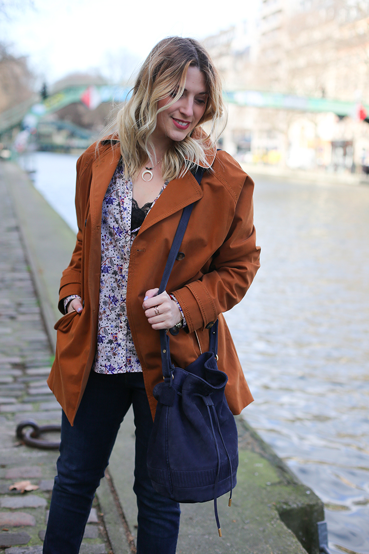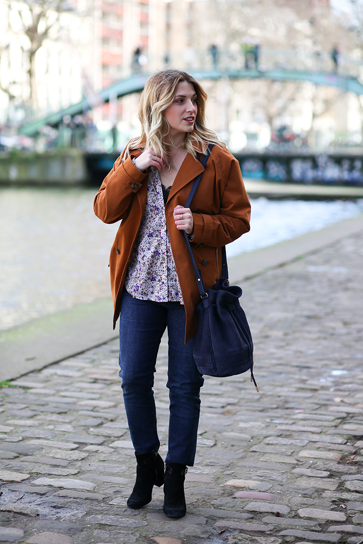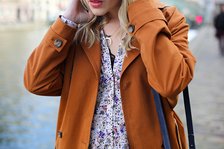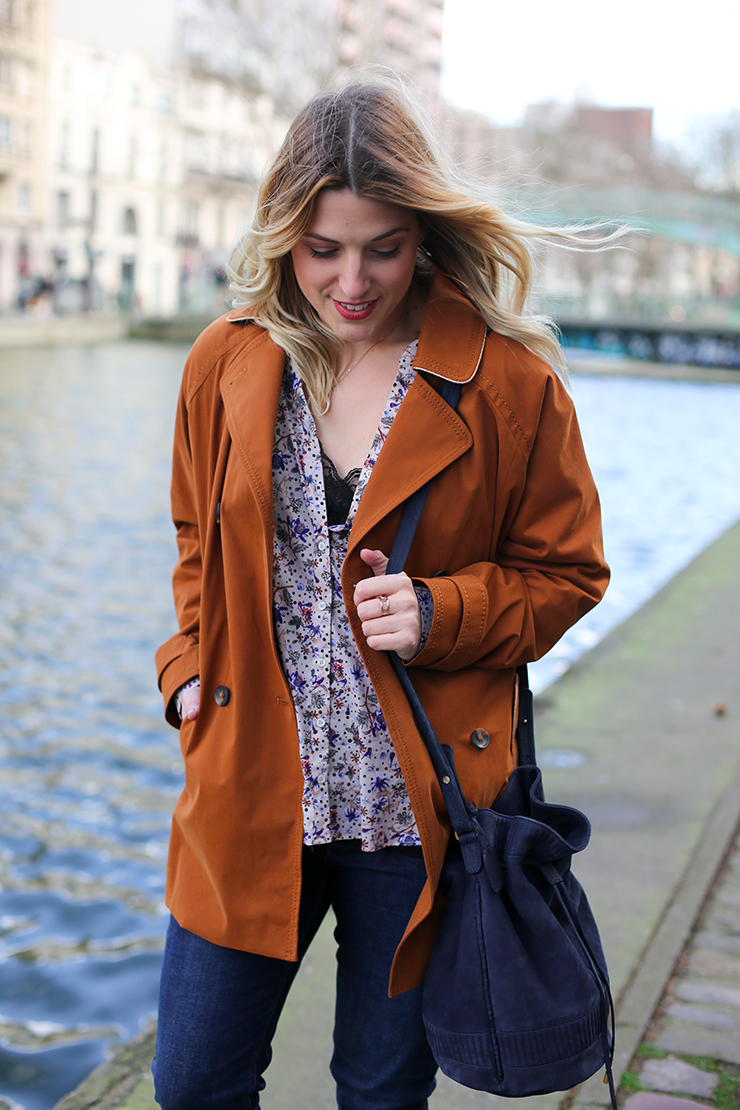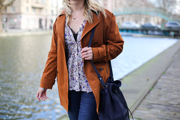 On commence la semaine avec un look. Parce que ça faisait bien longtemps par ici et aussi parce que One Step m’a proposé de redécouvrir la marque en choisissant une tenue. J’ai craqué sur ce trench camel, j’ai trouvé la couleur très originale et j’ai construit la silhouette autour de cette pièce. Une chemise fleurie (oui je suis très motifs à fleurs en ce moment), un sac seau et un jean. Je ne sais pas bien pourquoi j’ai choisi un jean ce jour-là car je n’en porte plus vraiment. Ayant quelques kilos à perdre ce n’est pas dans un jean que je me sens bien !