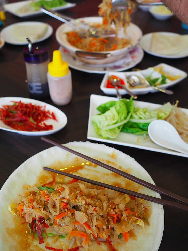 Premier déjeuner chez Good chance popiah, un restaurant chinois. J’ai commandé un popiah (la spécialité) : une galette de riz à customiser comme un burrito. Sauce sucrée, piment (en option), œuf, pousses de soja, saucisse séchée, cacahuètes et une préparation à base de navets. Super bon!