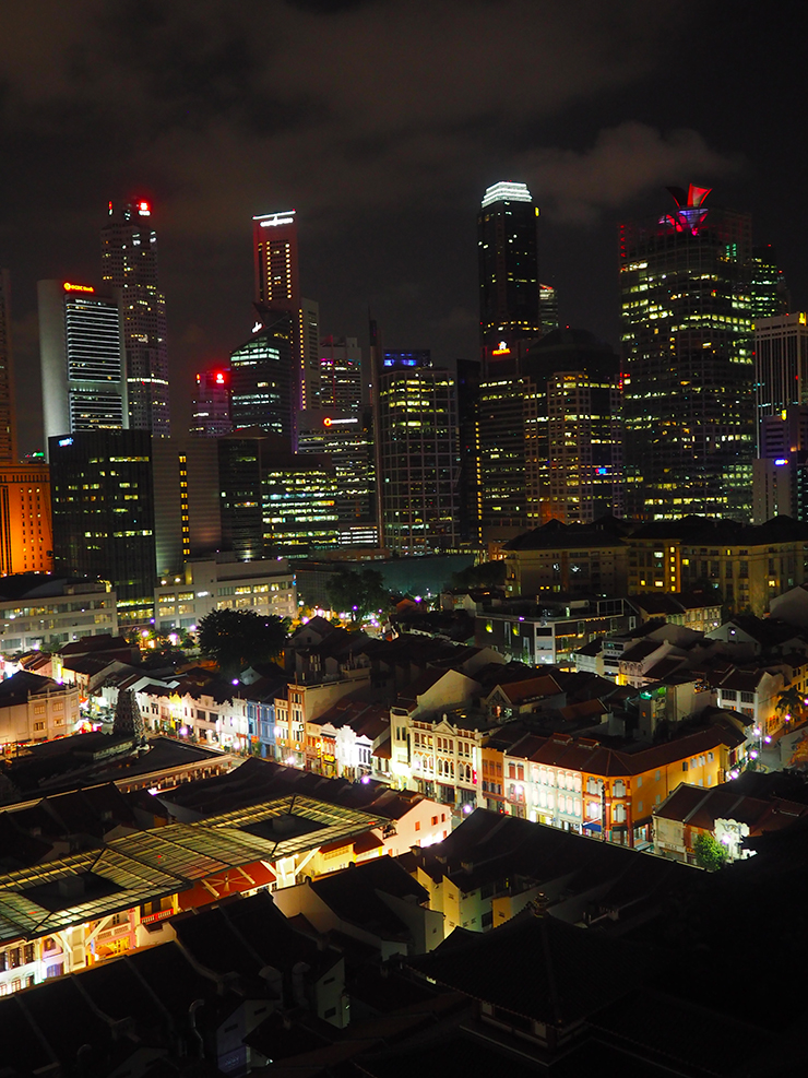 Pour profiter d’une belle vue sur la ville, de nuit, nous avons grimpé au dernier étage d’un immeuble juste derrière le Bouddha tooth relic temple.